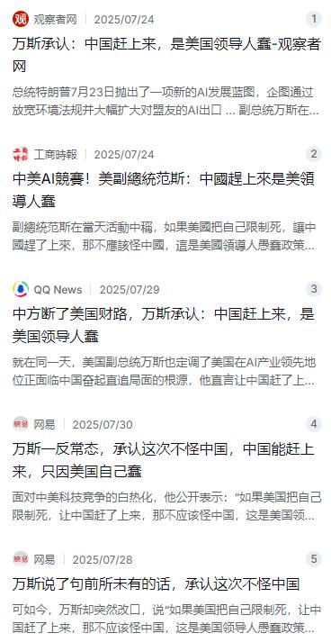 2025年7月23日,华盛顿,美国总统特朗普签署了新的AI发展蓝图,说要放宽环境法规、扩大对盟友的AI出口,确保美国在人工智能领域继续领先中国。同一天,副总统万斯在活动上说了一句让很多人没想到的话:“如果美国把自己限制死,让中国赶了上来,那不应该怪中国,这是美国领导人愚蠢政策的结果。”这话从一个长期对中国持强硬态度的政治人物嘴里说出来,反差确实不小。