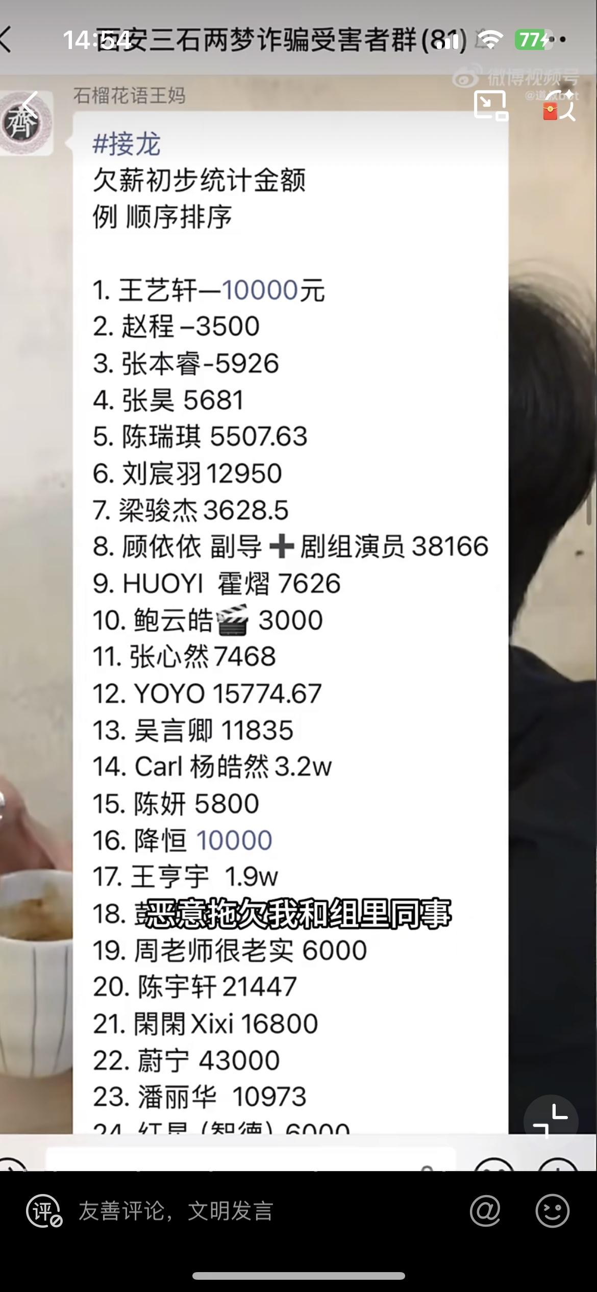 一短剧演员顾依依公开实名讨薪,指责制片人陈某雷公然欠薪,出言威胁。据她介绍,他们参与了短剧《重生千金归来》的短剧拍摄,剧组 80 多人被欠了 35 万元的薪水。从 去年 12 月短剧杀青后,已经 4 个多月,薪水还没有到账。顾依依在这部短剧里面担任了重要角色,同时也担任了该片副导演。她代表这些人向制片人讨薪,搞得心力交瘁。这一次逼得没办法,拿着身份证带着哭腔公开讨薪,希望引起舆论的关注。既然是剧组欠薪,为什么不通过劳动部门申请介入来解决呢?