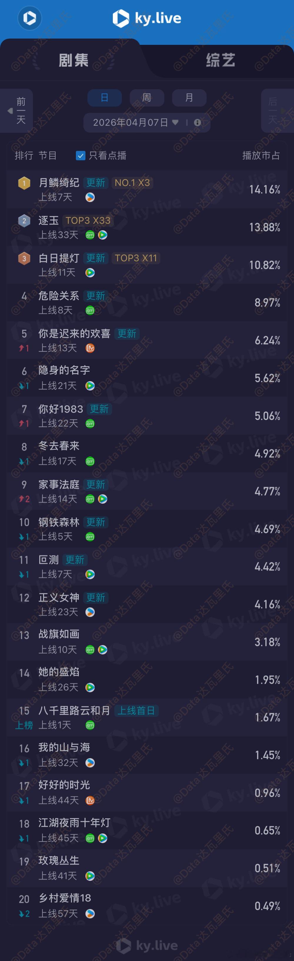 4.7酷云播放量(点播榜)家事法庭酷云全端播放量登顶 点播927万月鳞绮纪 单集14.16%2750万逐玉 13.88%,2697万,全端集均破7500万白日提灯 10.82%,2101万危险关系 ⏩超点 1743万钢铁森林4.69%,911万八千里路云和月 首日全端3153万,点播占比1.67%,325万