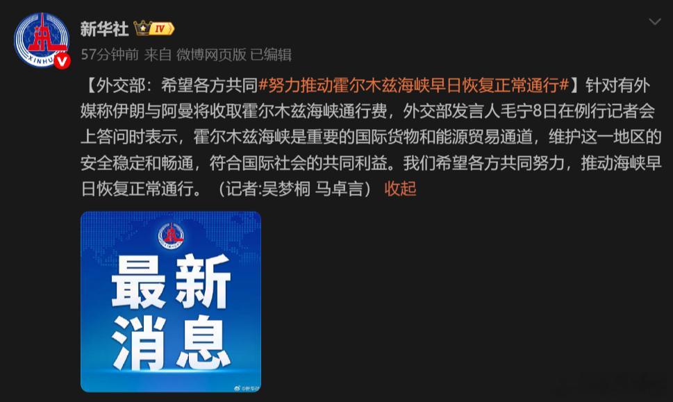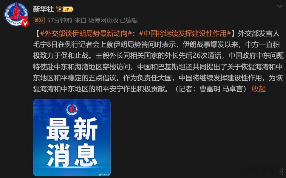 今(8)日,外交部例行记者会上,《纽约时报》记者提问,据报道,伊朗驻华大使向中方寻求对伊朗的安全保障。中方对考虑为伊朗提供安全保障持何立场?毛宁表示,我们希望各方能够通过对话谈判妥善地化解争端。中方也将同各方保持沟通,继续为缓和局势、全面平息战火作出努力。 美伊以冲突伊美双方停火生效特朗普提出停火或是脱身之计黄媒不会说的真相