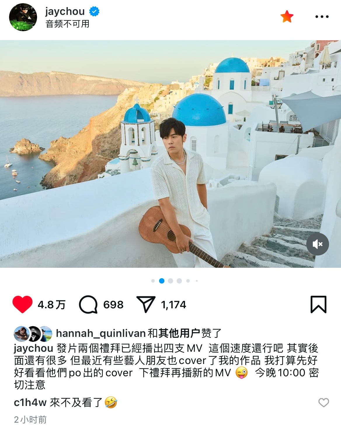 周杰伦更新动态:發片兩個禮拜已經播出四支MV 這個速度還行吧 其實後面還有很多 但最近有些藝人朋友也cover了我的作品 我打算先好好看看他們po出的cover 下禮拜再播新的MV 😜 今晚10:00 密切注意