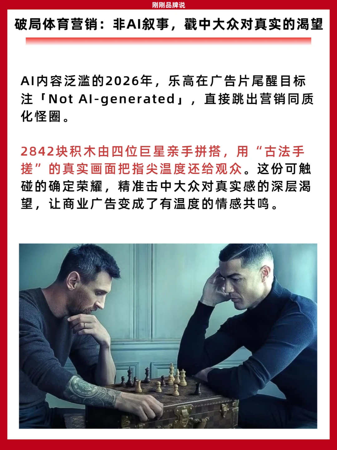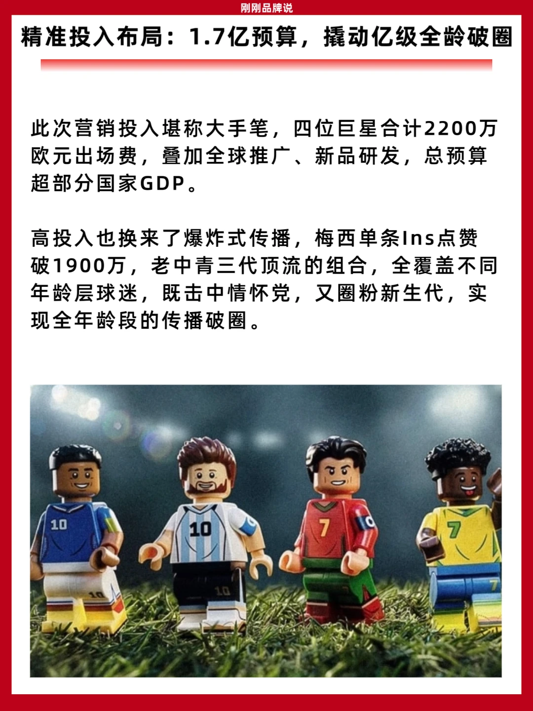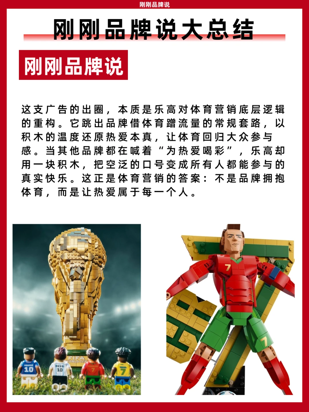 这支广告的出圈,本质是乐高对体育营销底层逻辑的重构。它跳出品牌借体育蹭流量的常规套路,以积木的温度还原热爱本真,让体育回归大众参与感。当其他品牌都在喊着“为热爱喝彩”,乐高却用一块积木,把空泛的口号变成所有人都能参与的真实快乐。这正是体育营销的答案:不是品牌拥抱体育,而是让热爱属于每一个人。