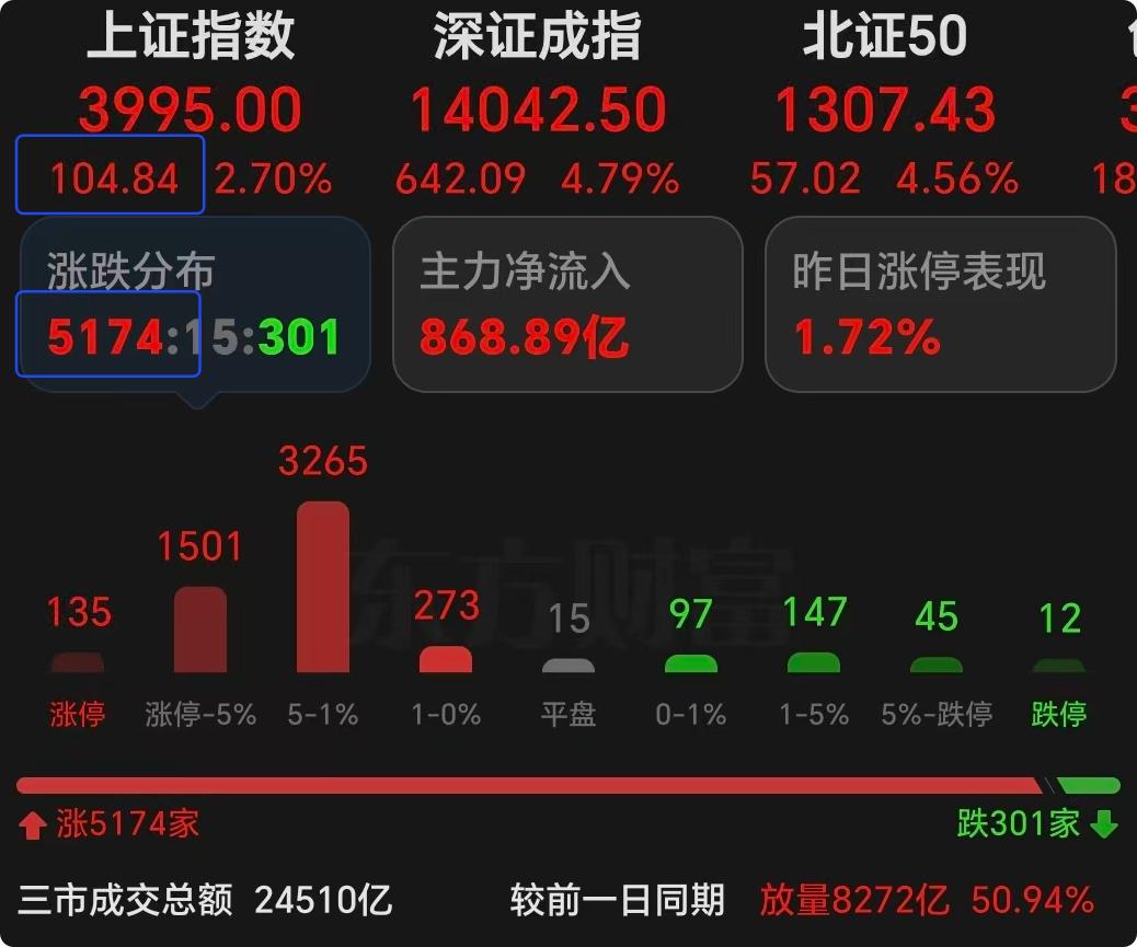 百点长阳直逼4000点,创业板指数狂涨6%,近5200只个股飘红!今天,咱们见证历史!