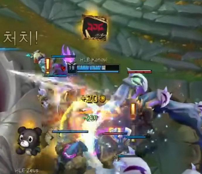 LCK常规赛Round1,HLE首局1:0领先DK。HLE打野Kanavi在比赛结束前,接连亮出了JDG、TES的队标。