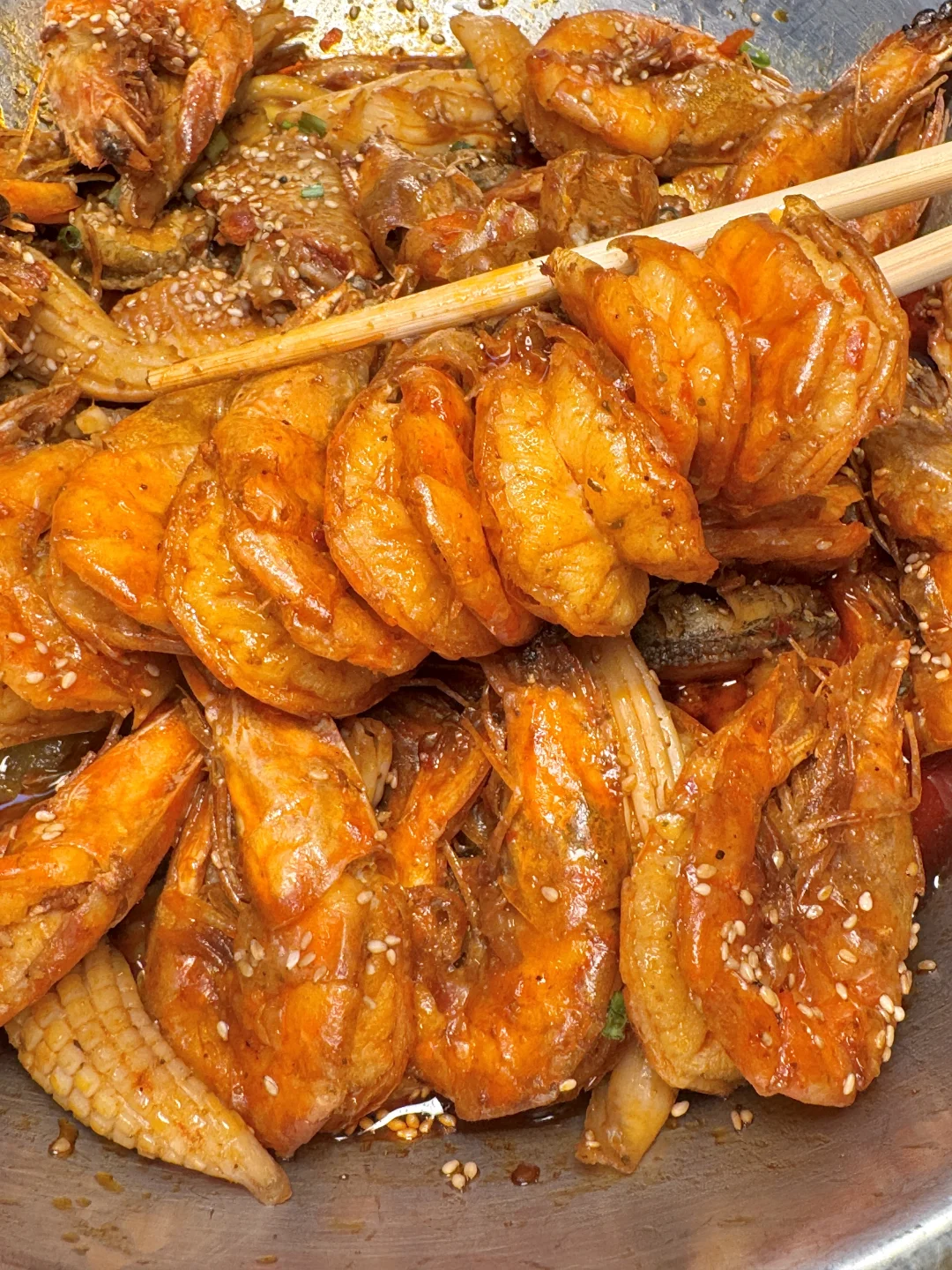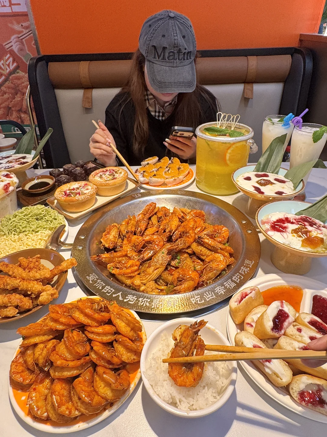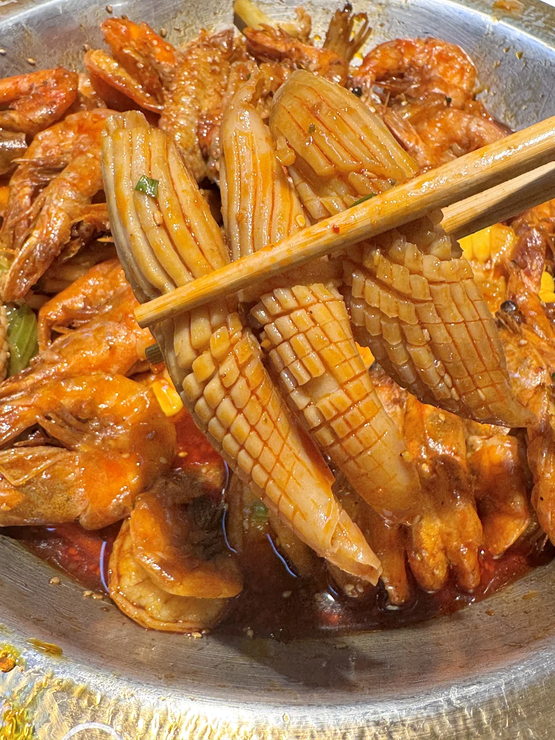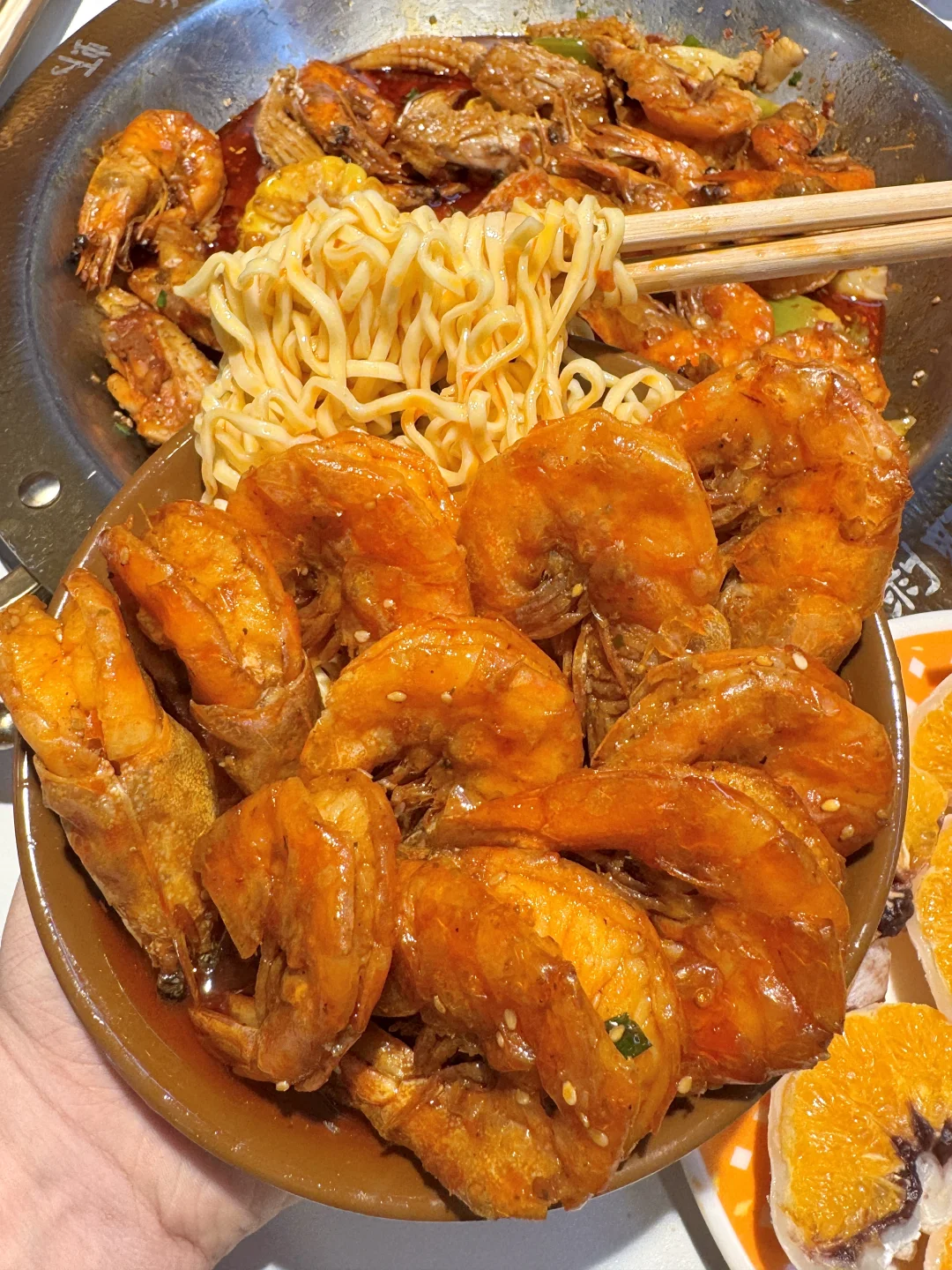 干锅虾是招牌,微辣就很好吃!!每一只虾都很大只,里面可以搭配鸡翅、鱿鱼、鸡蛋面…吸满汤汁越煮越香!!!连白米饭都吃了三碗😭😭