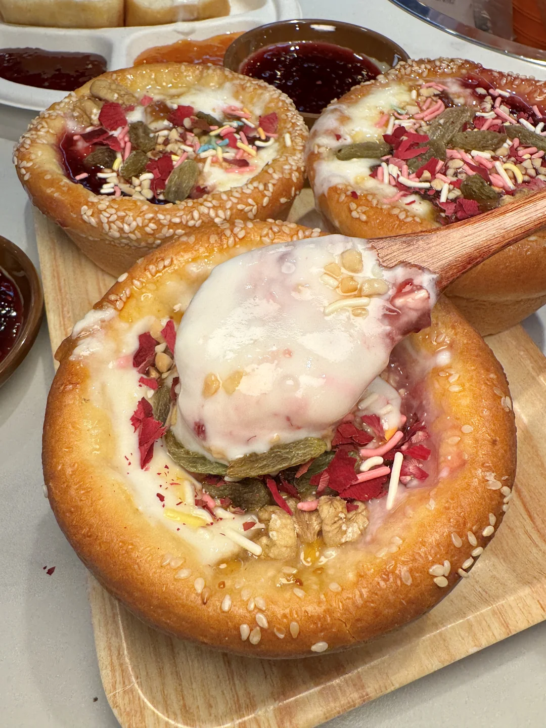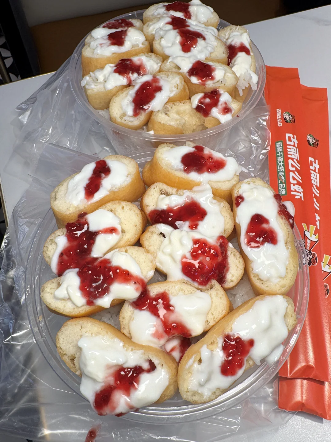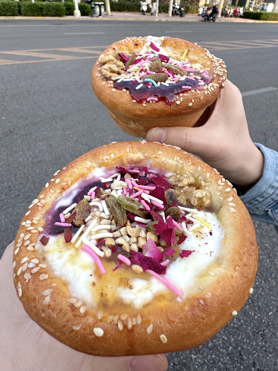 一定要趁热的时候吃~抹上秘制果酱,香酥甜糯!还有囊杯酸奶,囊皮酥脆搭配坚果果干酸奶,咬着吃挖着吃都不错!!
