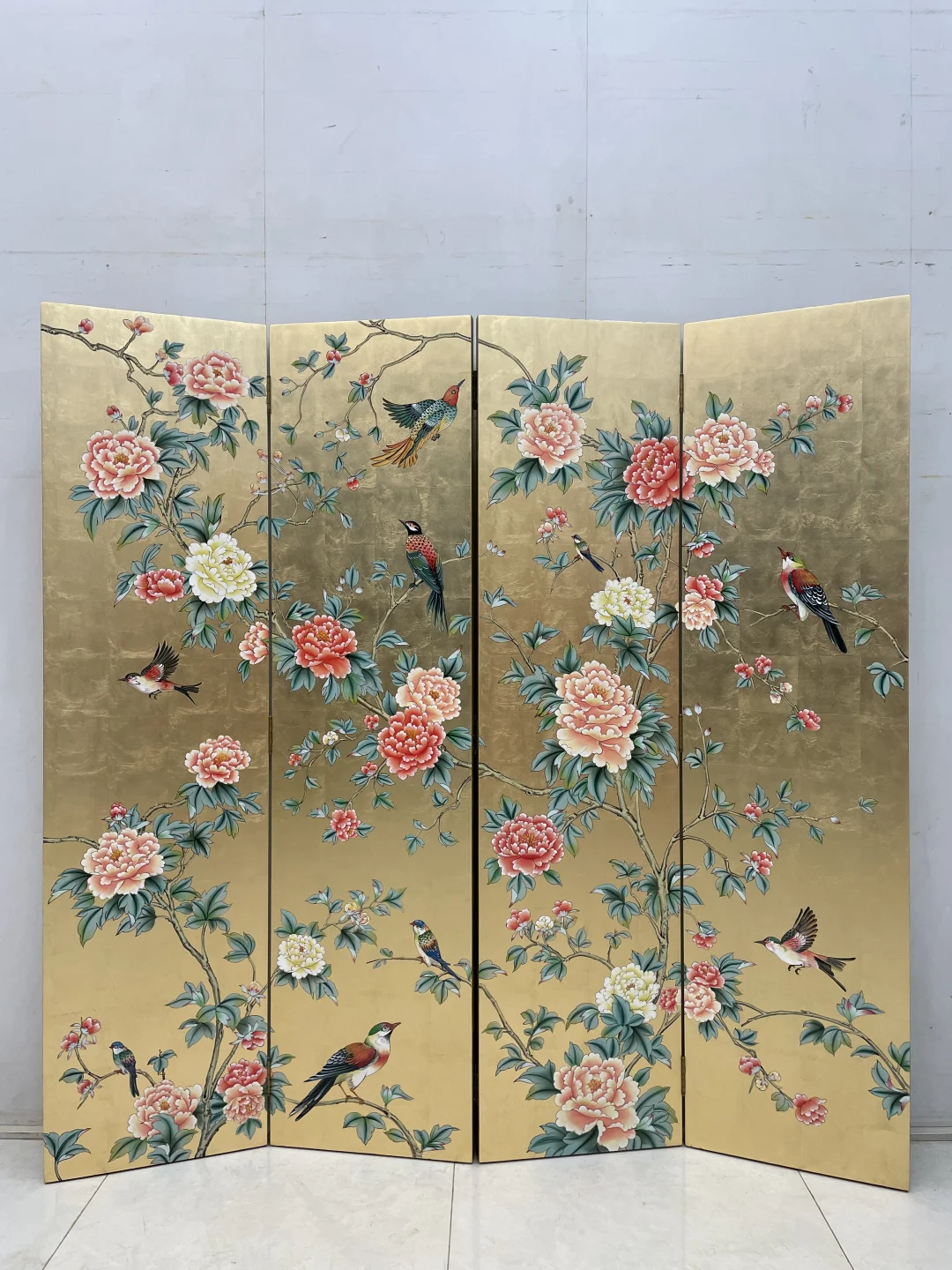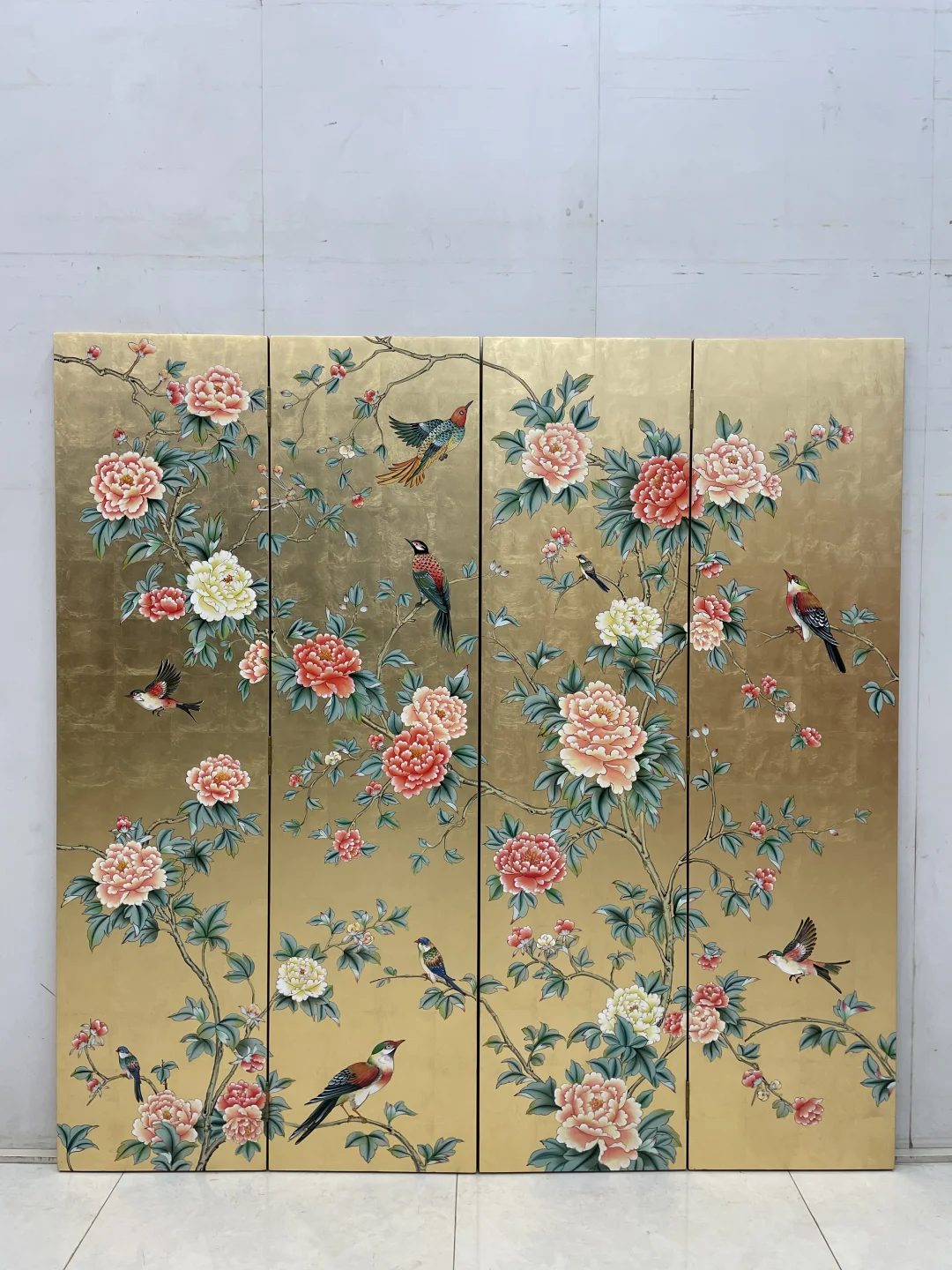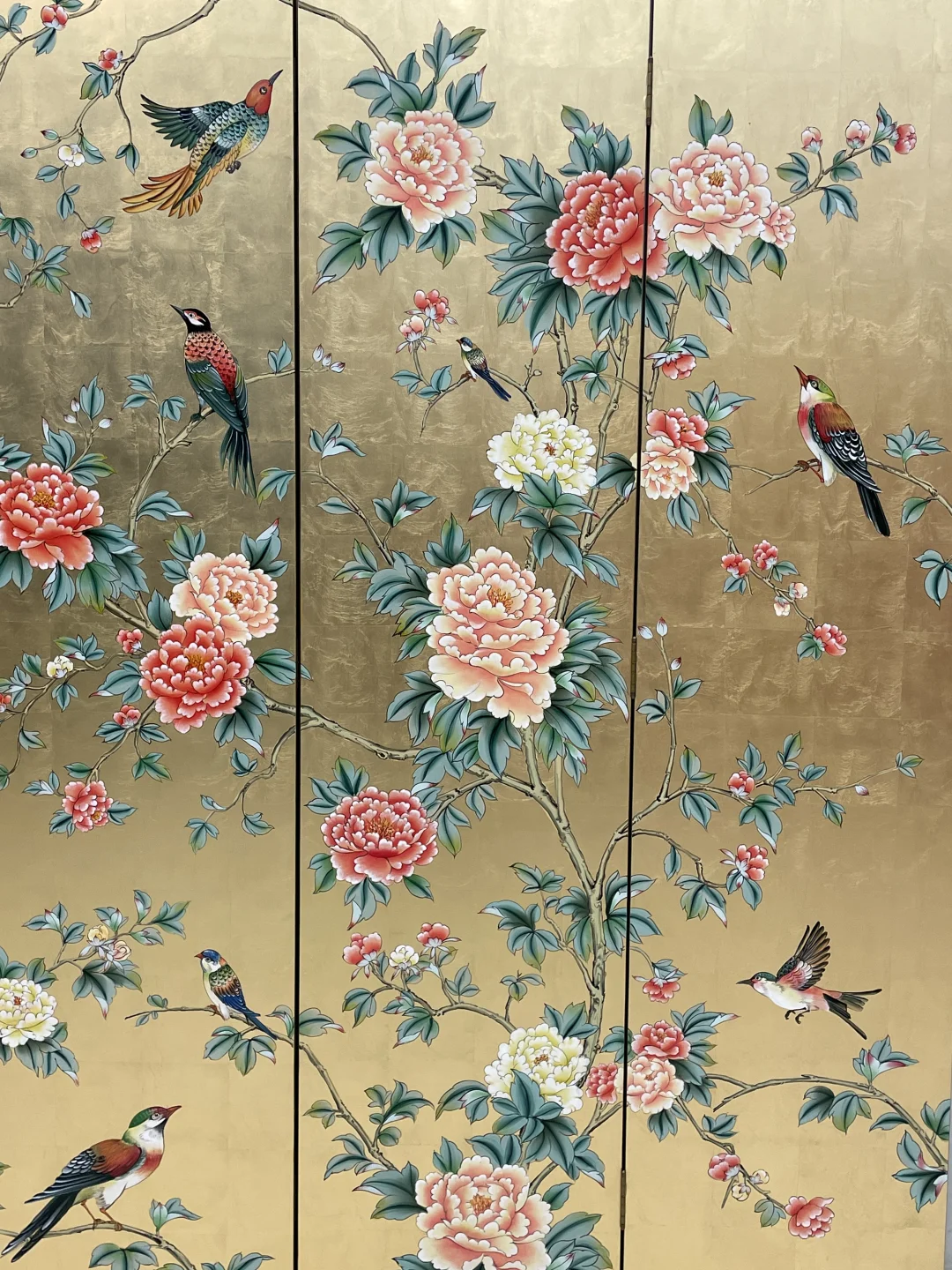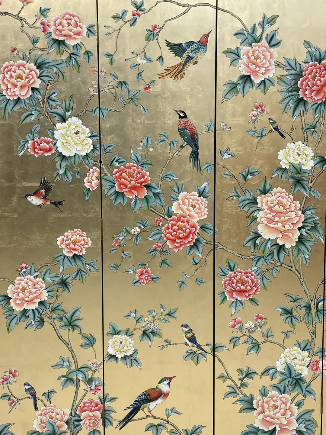 金箔底衬着盛放的牡丹,灵动的飞鸟穿梭花间,每一笔都是中式美学的浪漫。