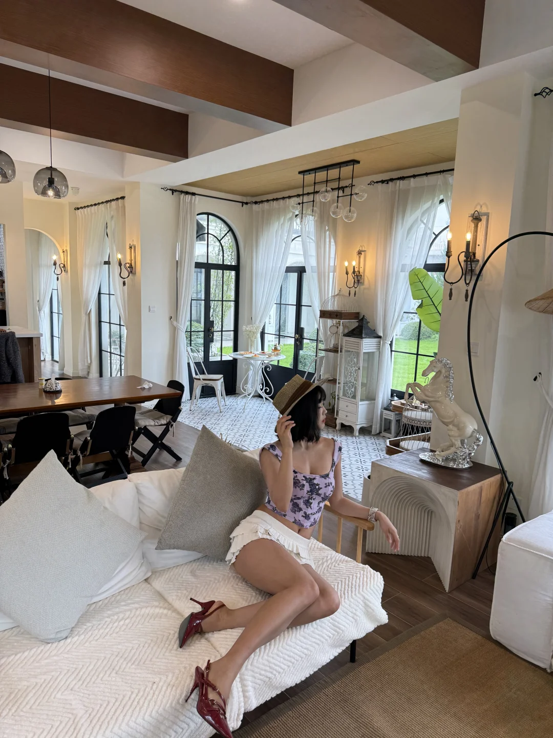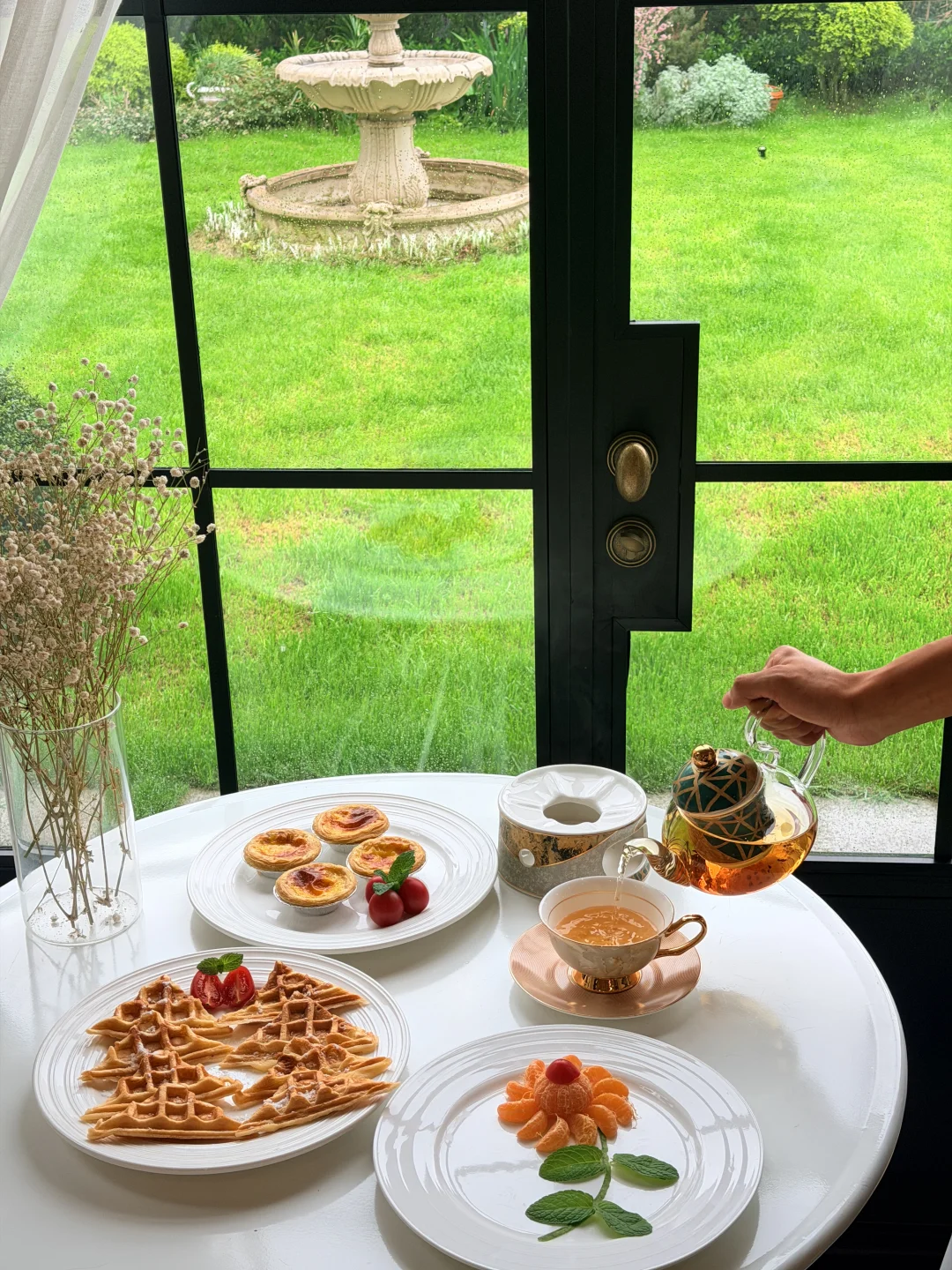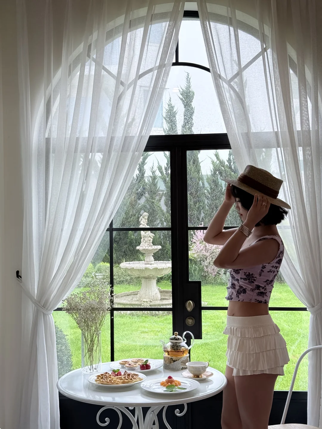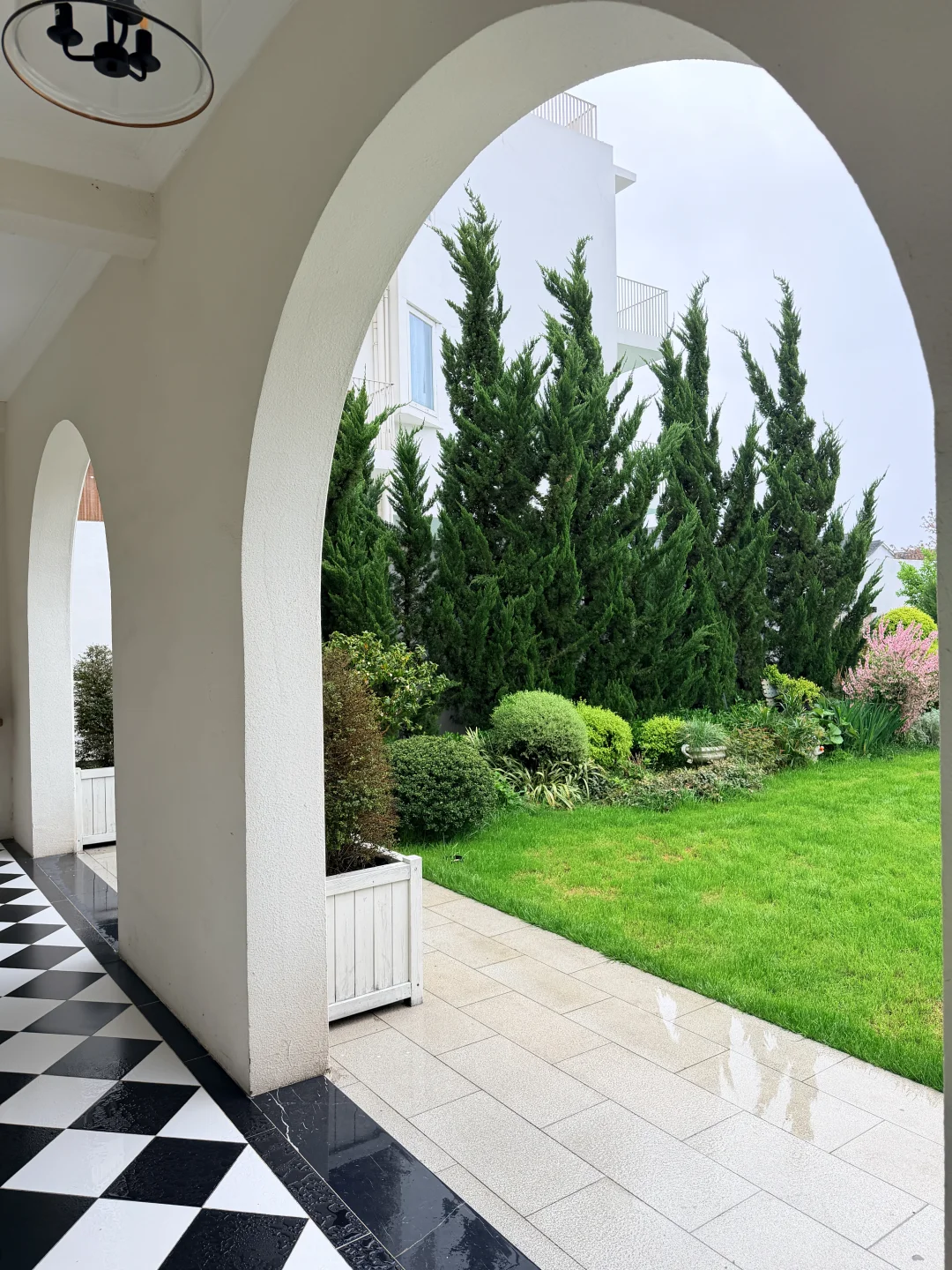 法式庄园风:白色建筑+墨绿藤蔓+黑色铁艺门窗+草坪中央巴洛克喷泉,雨天更有电影感!周边景点:淀山湖风景区(20分钟车程)、锦溪古镇、周庄古镇