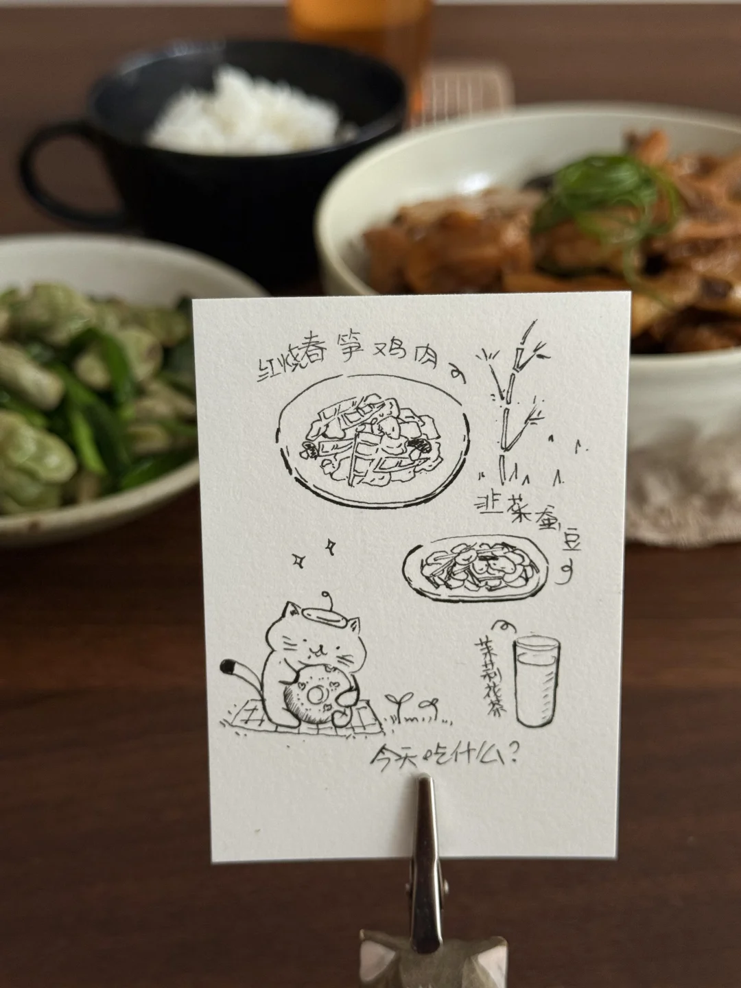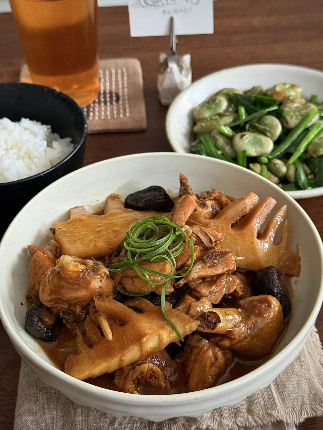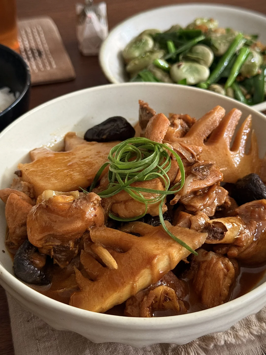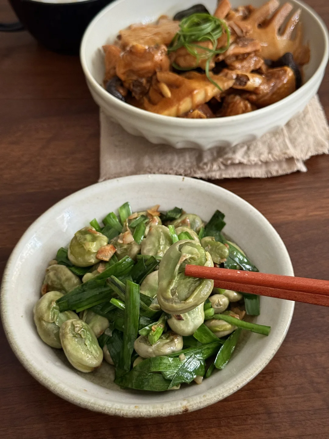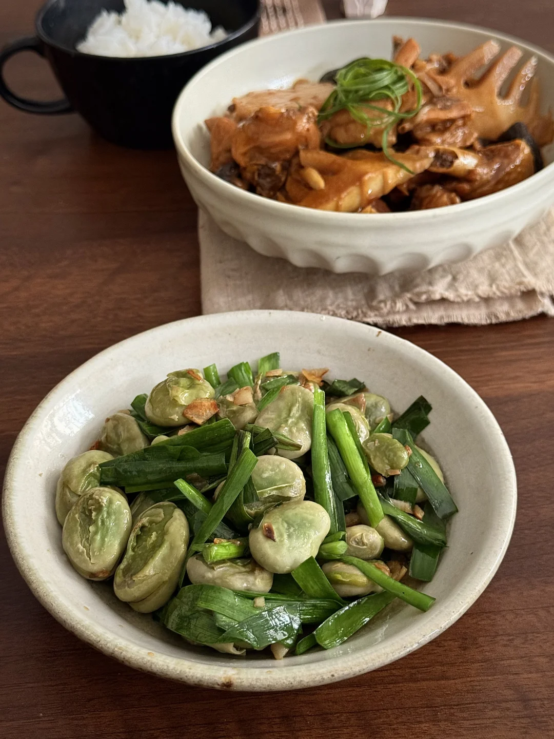 春笋焖鸡腿肉、韭菜炒蚕豆