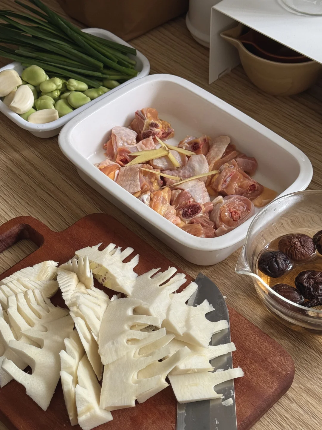 食材|鸡腿肉、春笋、泡发香菇、姜、蒜、小葱