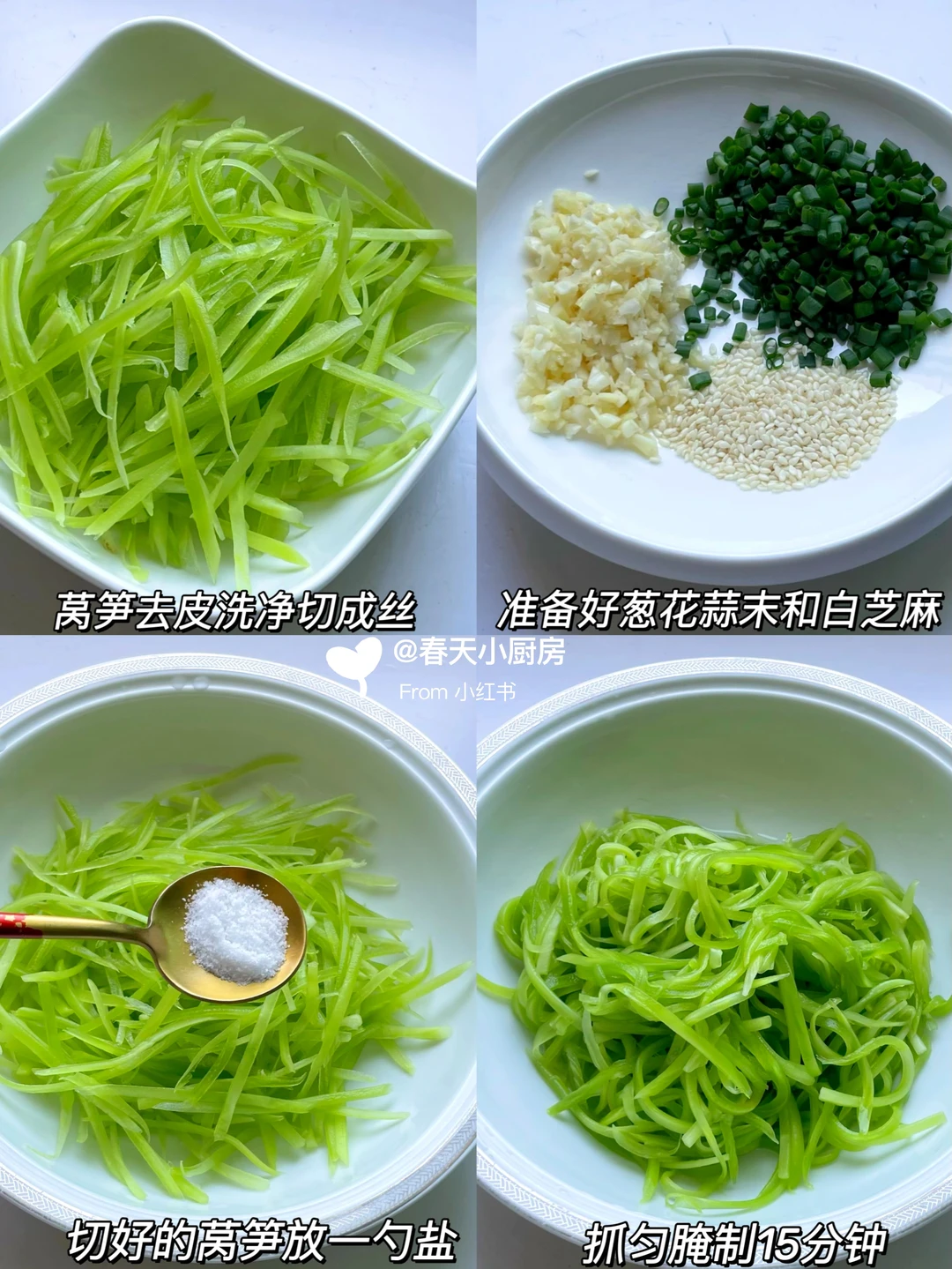 2⃣️莴笋丝放入碗中,加适量盐抓匀,腌制15分钟杀出水分,然后用凉白开冲洗一遍,挤干水分装盘,这一步是莴笋丝清脆的关键!