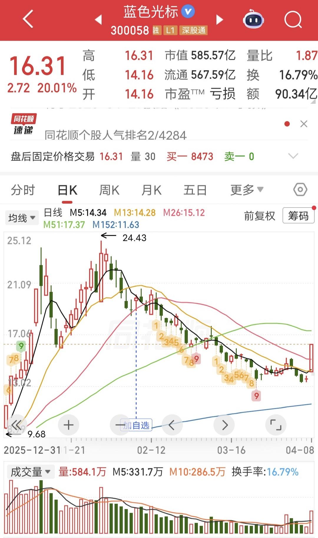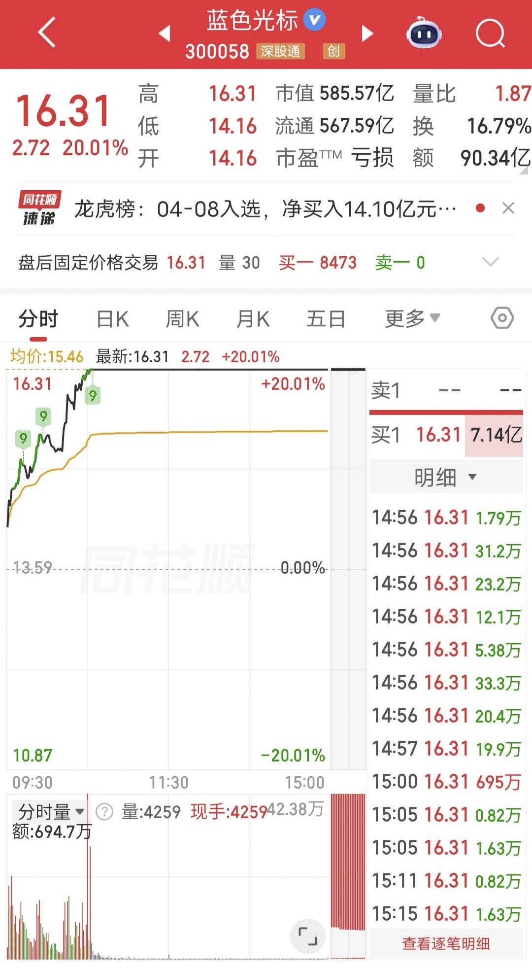 今天市场爆量,蓝色光标20cm拉板。