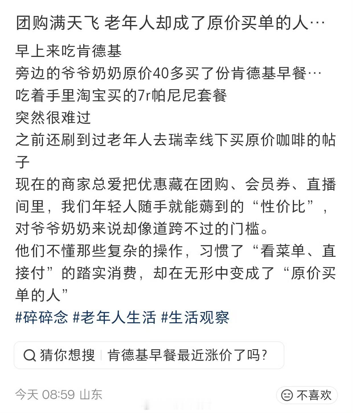 旁边的爷爷奶奶原价买了肯德基早餐,团购满天飞,老年人却成了原价买单的人