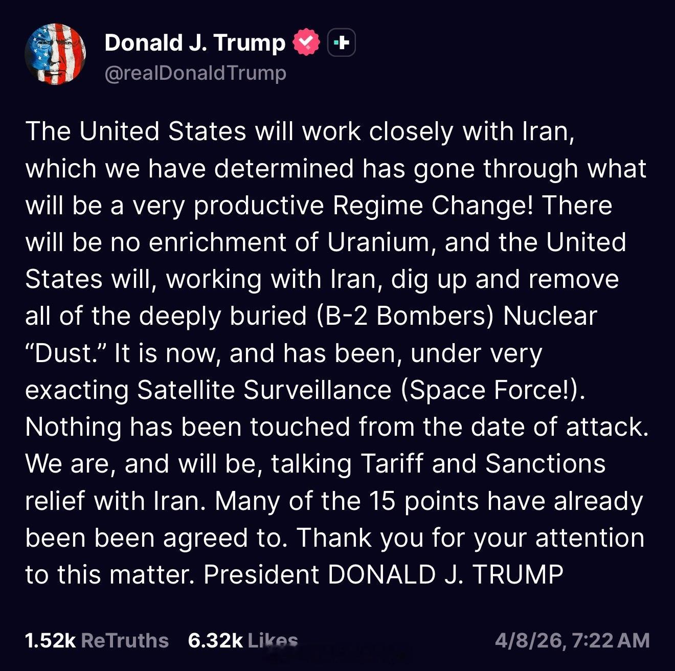 “美国将与伊朗密切合作。我们已确认伊朗经历了一场将极具成效的政权更迭!