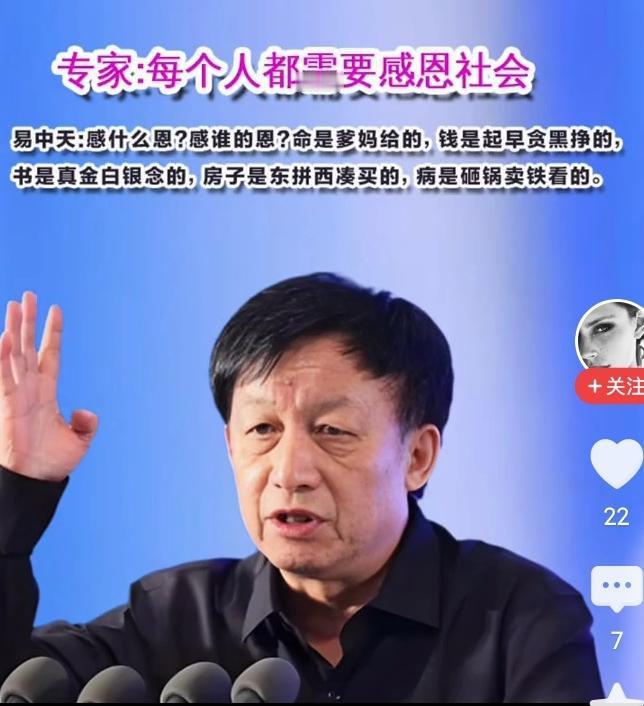在很多年之前,针对某专家说,每个人都需要感恩社会,易中天非常反感,他曾有名言:感什么恩?感谁的恩?命是爹妈给的,钱是起早贪黑挣的,书是真金白银念的,房子是东拼西凑买的,病是砸锅卖铁看的,