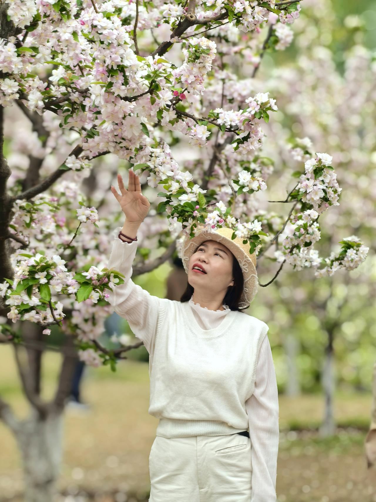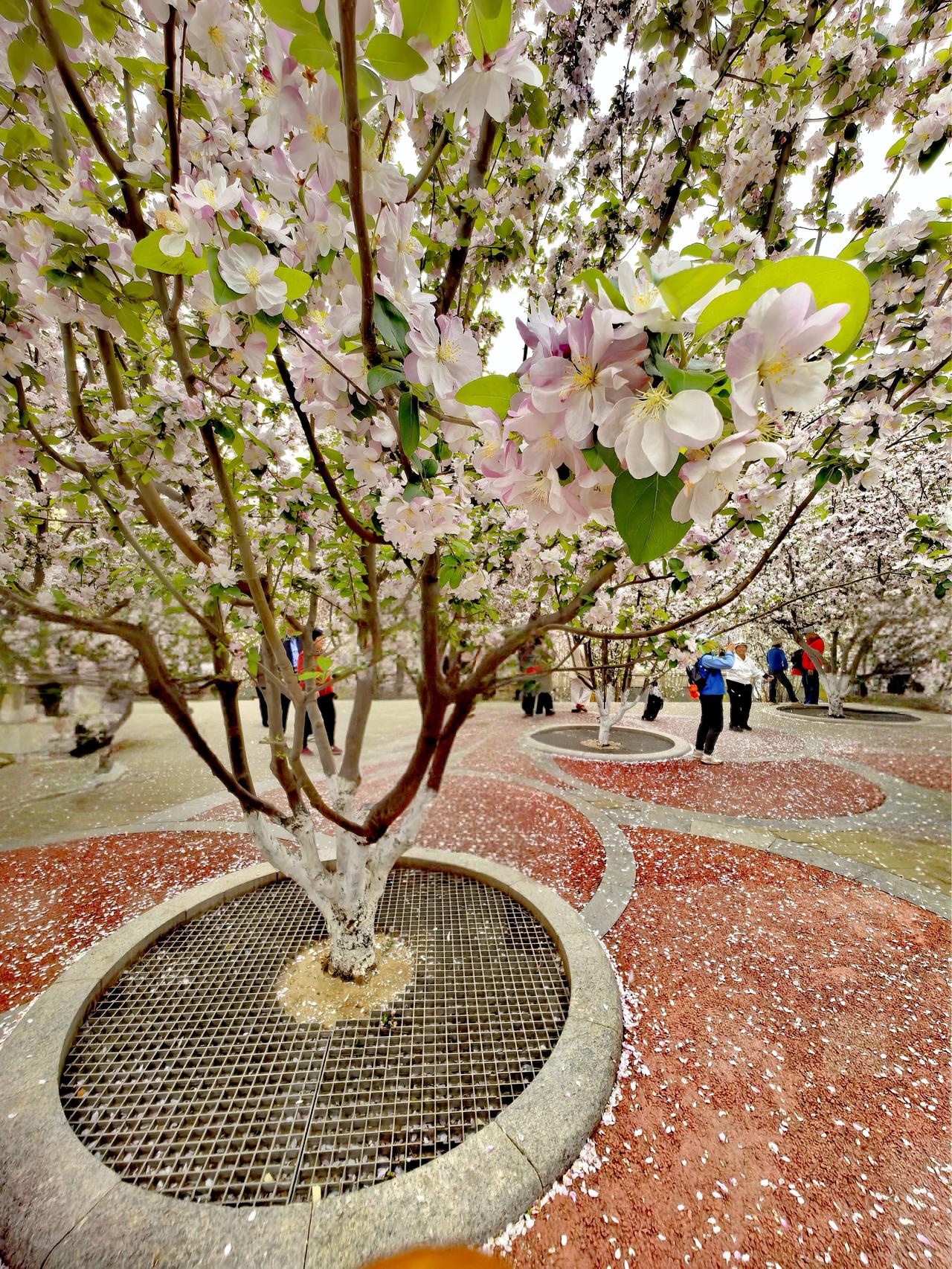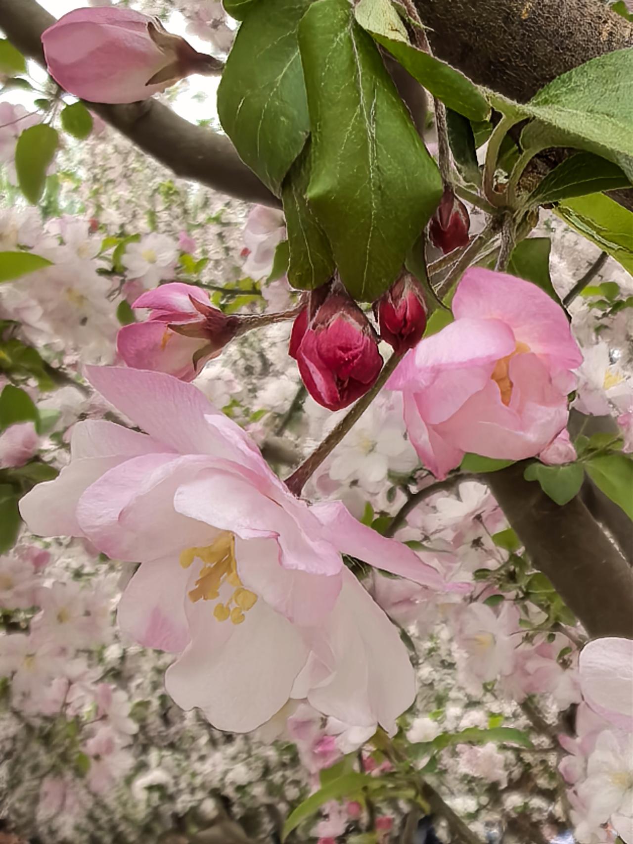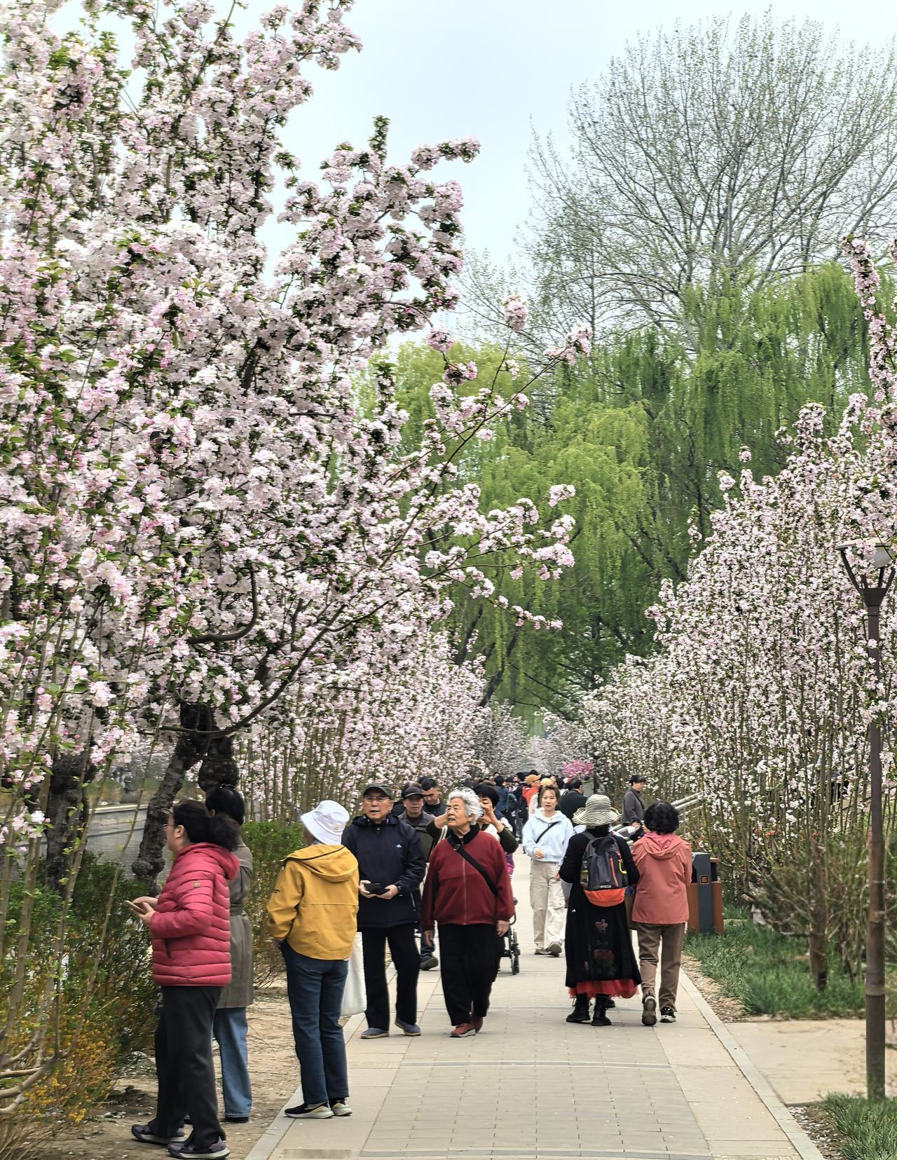 今天天气多云转阴,下午还下起了小雨。这样的天气加上又是下午,我以为北土城遗址公园的海棠花溪赏花、寻景、拍照的人应该不会很多,结果我的预期还是错了。赏花和拍照的人虽然没有摩肩擦踵,但也川流不息,随时随地都可以看见人们举着手机、相机对着花树拍照,让同伴帮助自己留下最美的倩影。