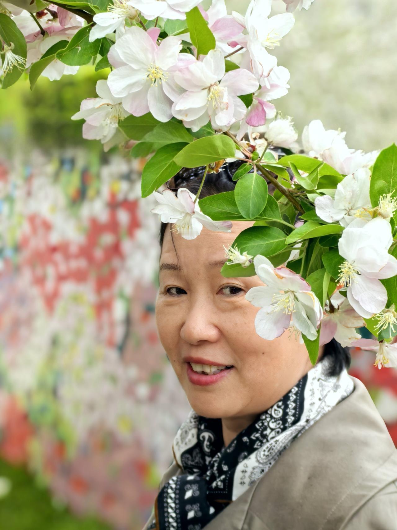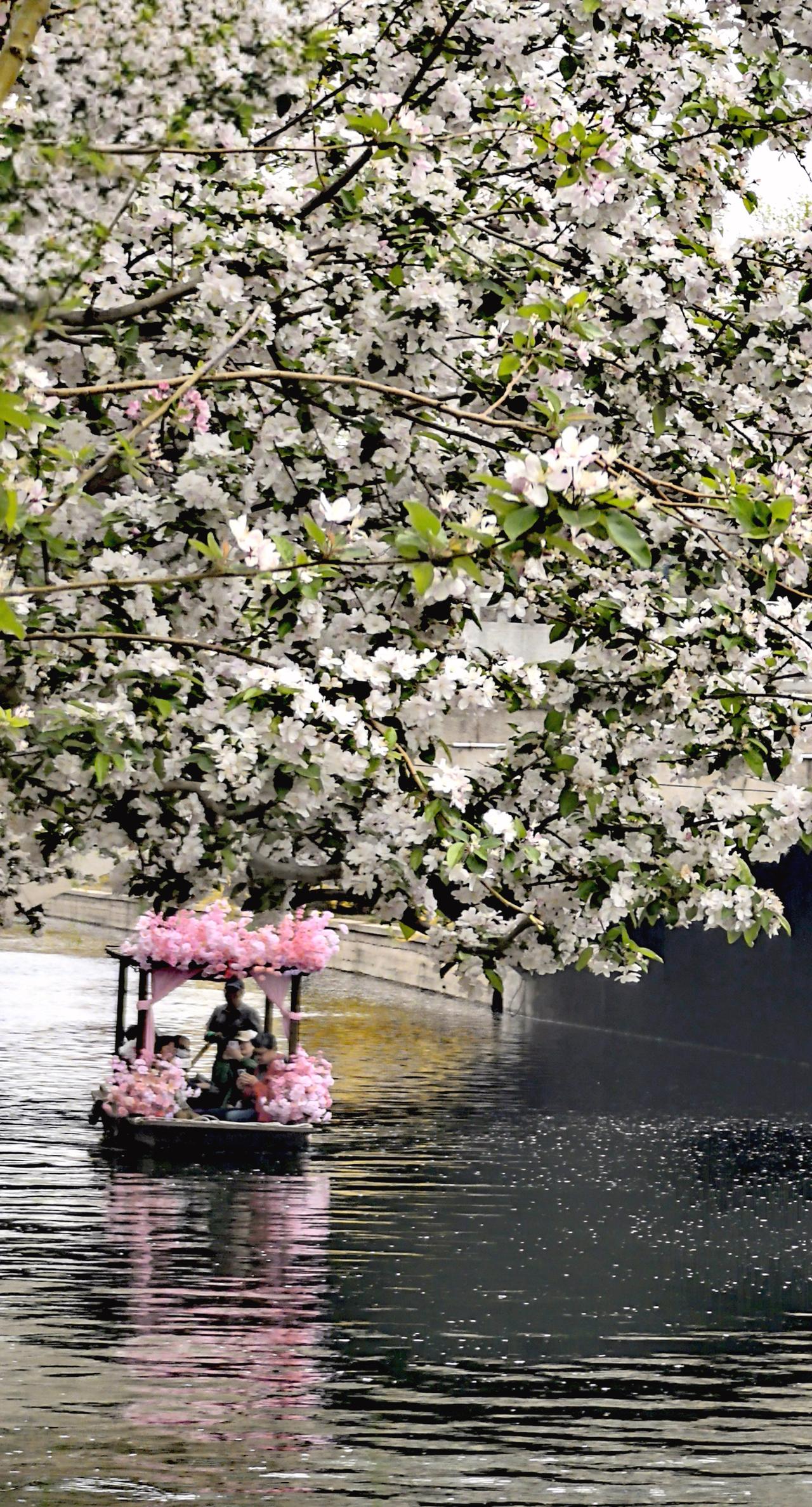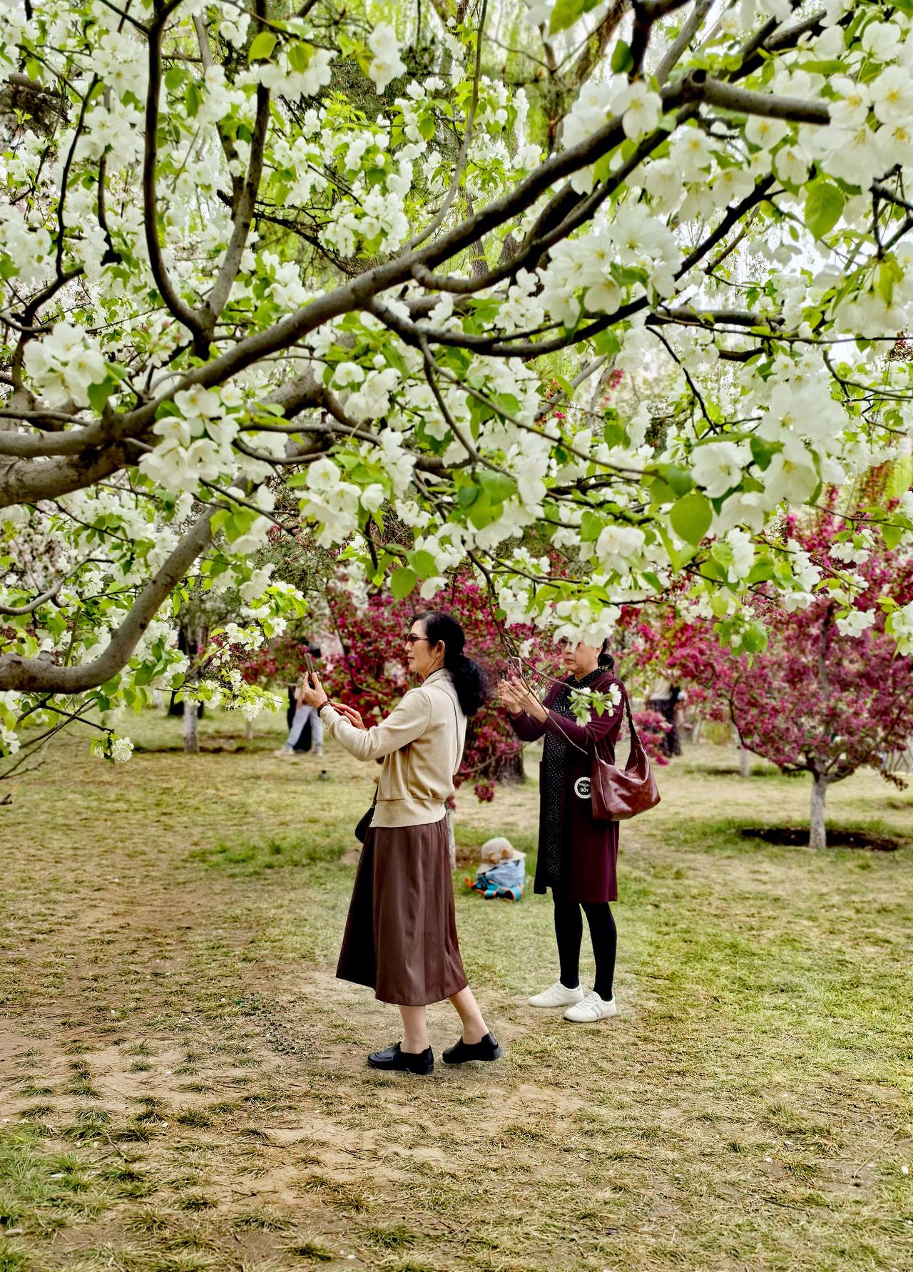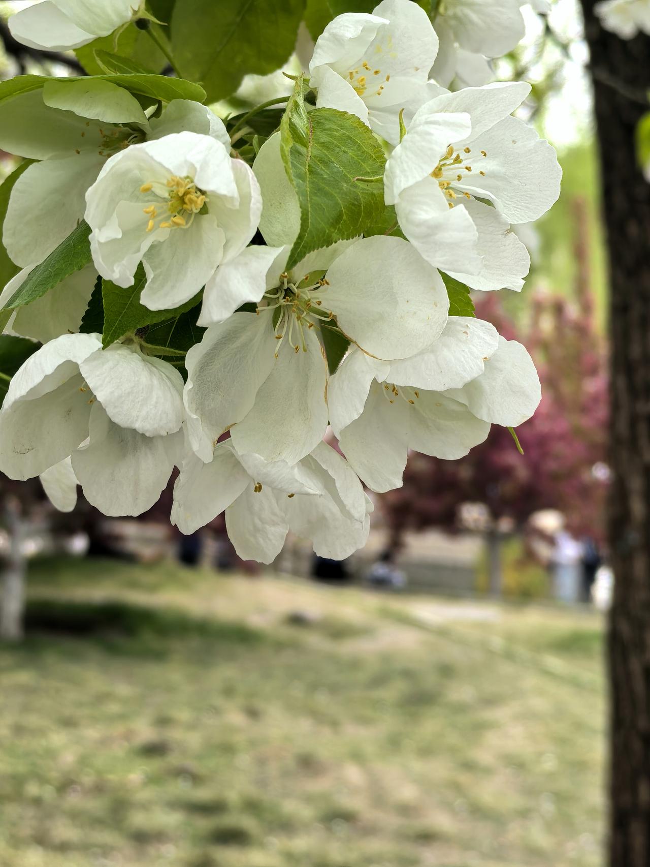 今天天气多云转阴,下午还下起了小雨。这样的天气加上又是下午,我以为北土城遗址公园的海棠花溪赏花、寻景、拍照的人应该不会很多,结果我的预期还是错了。赏花和拍照的人虽然没有摩肩擦踵,但也川流不息,随时随地都可以看见人们举着手机、相机对着花树拍照,让同伴帮助自己留下最美的倩影。