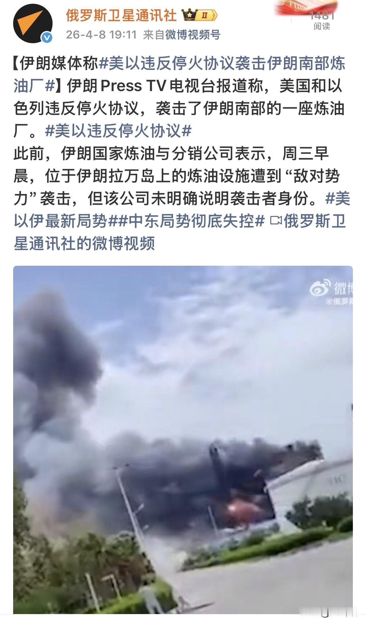 伊朗媒体指责美以违反了双方早前达成的停火协议,在停火协议生效后仍袭击了伊朗南部一座炼油厂。