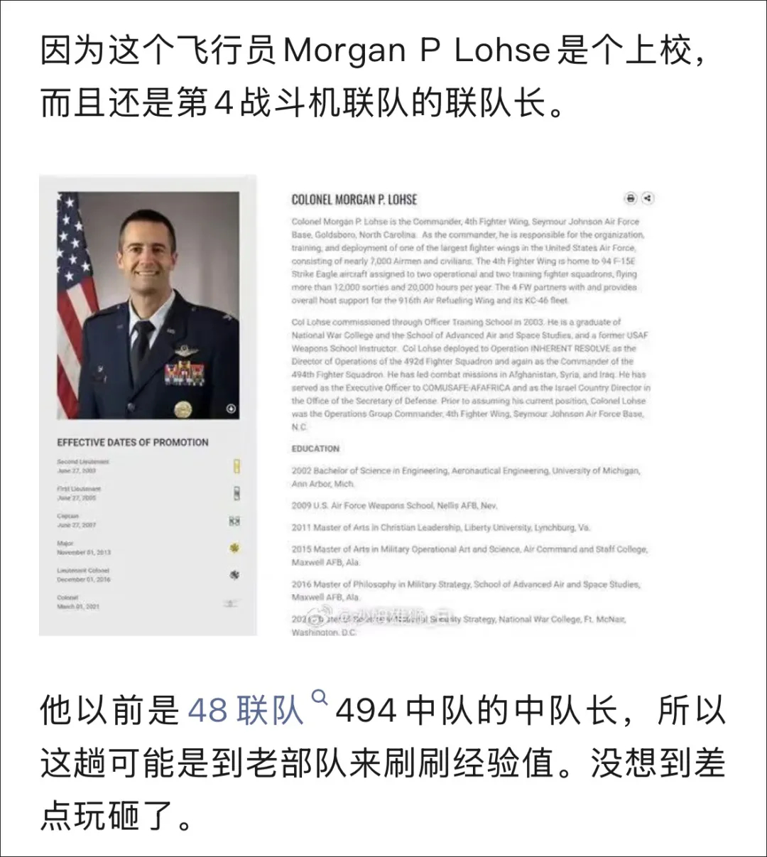 现在,这位摩根·P·洛西上校的简历已经被释放出来:他是美国空军第4战斗机联队的指挥官,驻地为北卡罗来纳州戈德斯伯勒的西摩·约翰逊空军基地,该联队由近7000名军人和文职人员组成,是94架F-15E“攻击鹰”战斗机的驻地,这些飞机分属于两个作战战斗机中队和两个训练战斗机中队。洛西上校于2003年通过军官训练学校获得了任命,是国家战争学院及高级空天研究院的毕业生,并曾担任美国空军武器学校的教官。曾在阿富汗、叙利亚和伊拉克指挥过作战。还曾担任驻欧美非空军司令的执行官,以及国防部长办公室的以色列国家主管。
