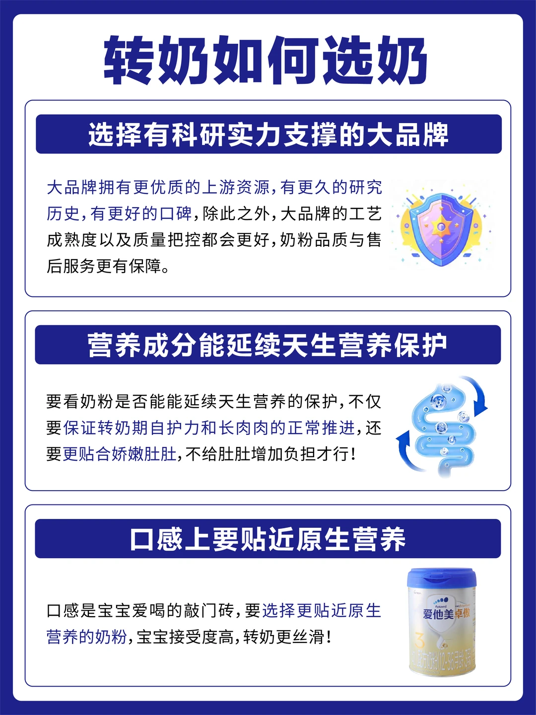 这可是转奶软着陆的关键,除了选择有科研实力支撑的大品牌,更要看奶粉是否能能延续天生营养的保护,不仅要保证转奶期自护力和长肉肉的正常推进,还要更贴合娇嫩肚肚,不给肚肚增加负担才行,宝宝接受度更高!