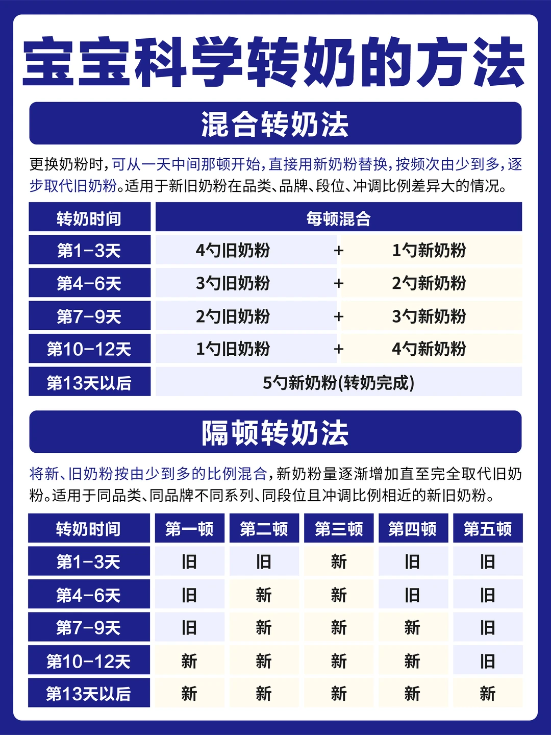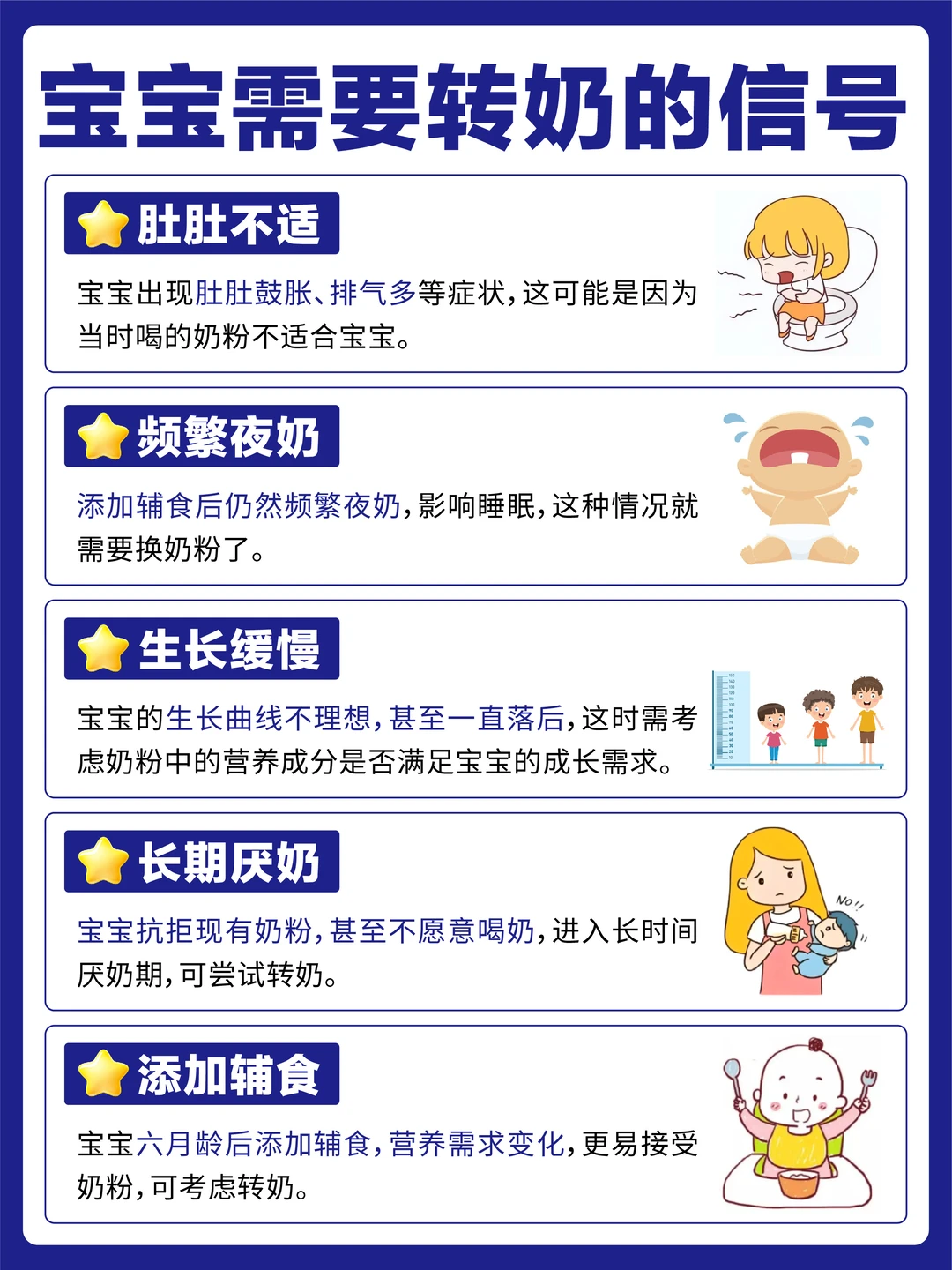 在转奶过程中,要密切观察宝宝的反应。如果宝宝出现肚肚不舒服的情况,要及时停止转奶。情况轻微且精神状态正常的宝宝可以单次奶量减少,少吃多餐,放缓速度,直至转奶成功