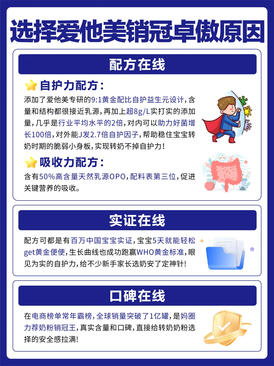 我当时也是做了不少功课才敲定这款爱他美卓傲,再加上超8g/L实打实的添加量,几乎是行业平均水平的2倍,对内可以助力好菌增长100倍,对外能J发2.7倍免Y球蛋白,帮助稳住宝宝转奶时期的脆弱小身板,实现转奶不掉自护力!