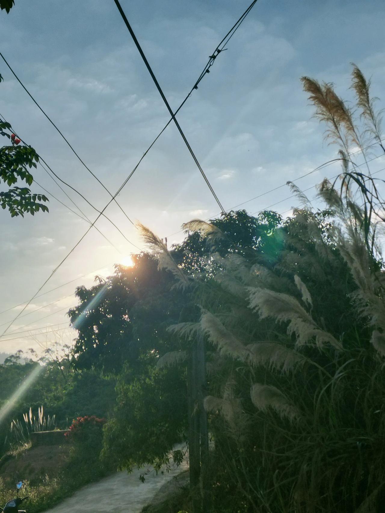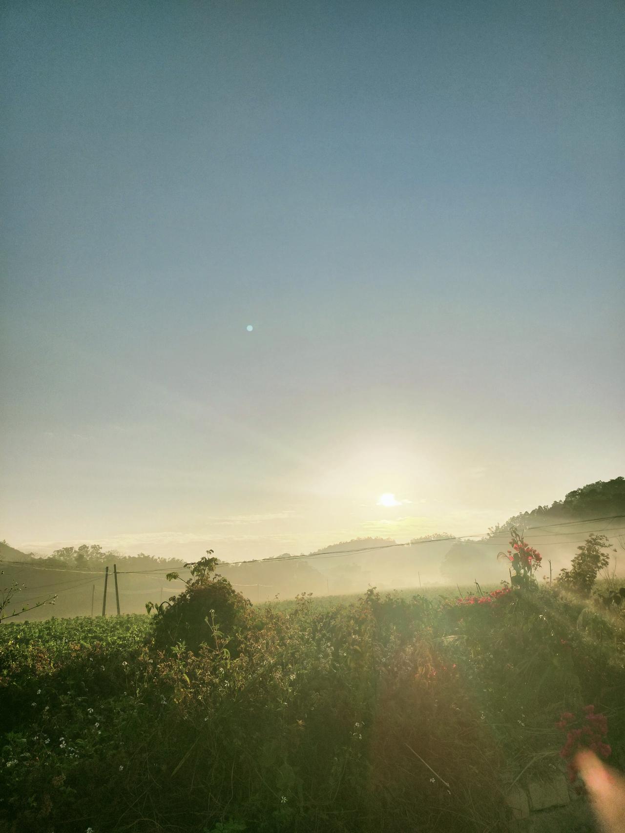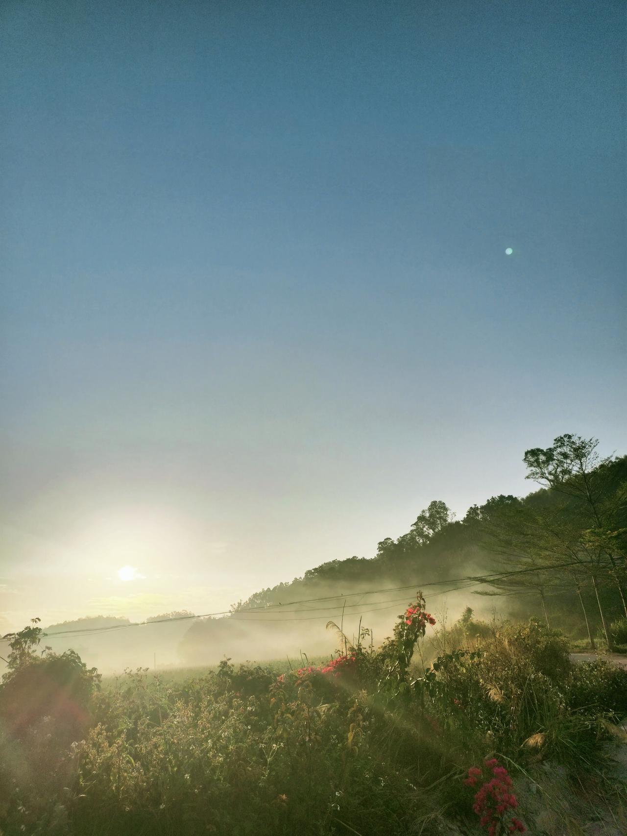 晨雾裹着山径,太阳刚挣出云层,把光揉进淡蓝的天。路边草木浸在薄纱似的雾里,电线杆牵着线隐进绿意,风过处,雾丝轻轻晃。