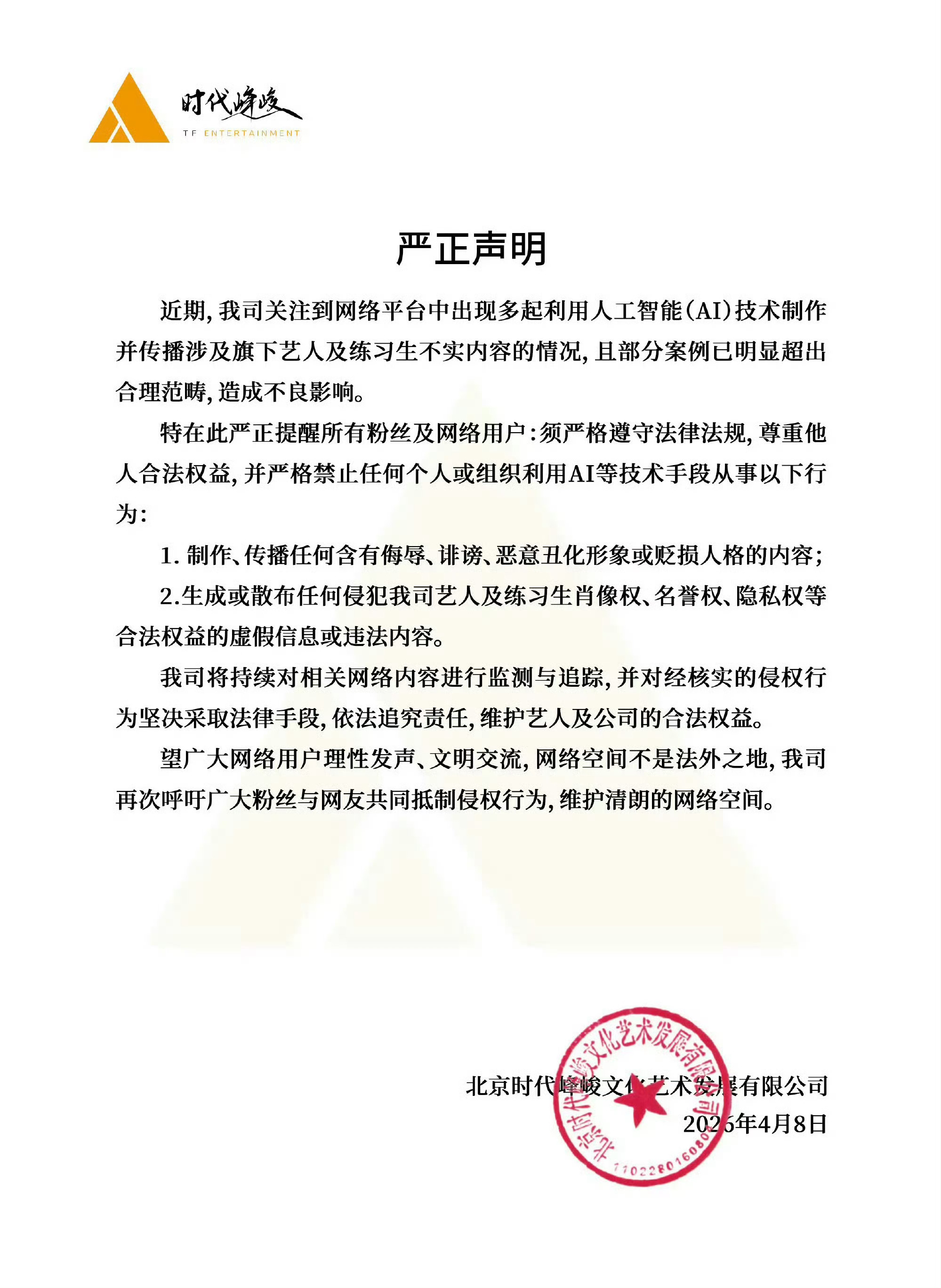刘耀文流口水 AI生成AI技术不该成为伤害他人的工具,共同守护清朗网络空间。 时代峰峻声明