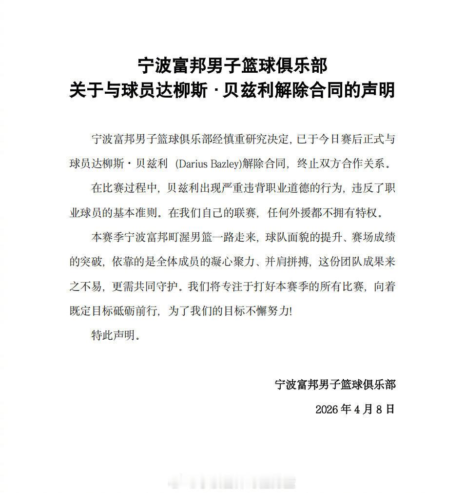 今天比赛中,贝兹利和队友吵起来了。比赛一结束,宁波第一时间就宣布和他解约。影响队内气氛不可取,这效率确实高。