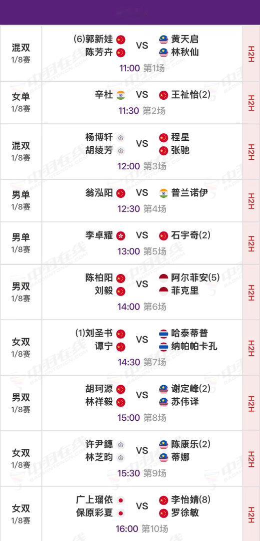 【二号场地】①🇨🇳郭新娃/陈芳卉vs黄天启/林秋仙🇲🇾②🇨🇳王祉怡vs辛杜🇮🇳③🇨🇳程星/张驰vs杨博轩/胡绫芳ᴛᴘᴇ④🇨🇳翁泓阳vs普兰诺伊🇮🇳⑤🇨🇳石宇奇vs李卓耀🇭🇰⑥🇨🇳陈柏阳/刘毅vs阿尔菲安/菲克里🇮🇩⑦🇨🇳刘圣书/谭宁vs哈泰蒂普/纳帕帕卡孔🇹🇭⑧🇨🇳胡珂源/林祥毅vs谢定峰/苏伟译🇲🇾⑨🇨🇳何济霆/任翔宇vs黄劲腾/黄家豪🇸🇬⑩🇨🇳李怡婧/罗徐敏vs广上瑠依/保原彩夏🇯🇵