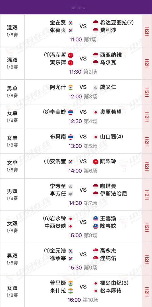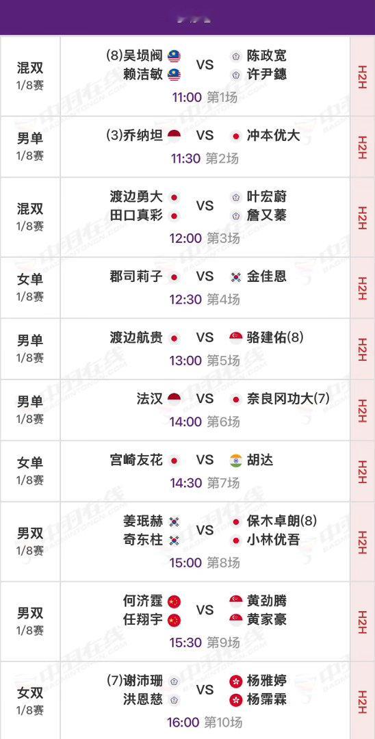 2026年羽毛球亚锦赛 1/8决赛北京时间11:00开始,可在央视各平台、羽协公众号/视频号、优酷观赛实时比分:网页链接官方赛程:网页链接