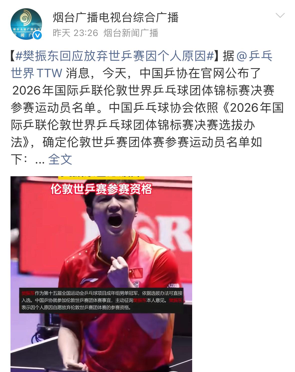昨晚,看到樊振东没有出现在国乒伦敦世乒赛大名单上之后,心里有些失落之下,就早早睡了。刚刚,一早起来,看到的第一条热搜却是“樊振东回应放弃世乒赛因个人原因”