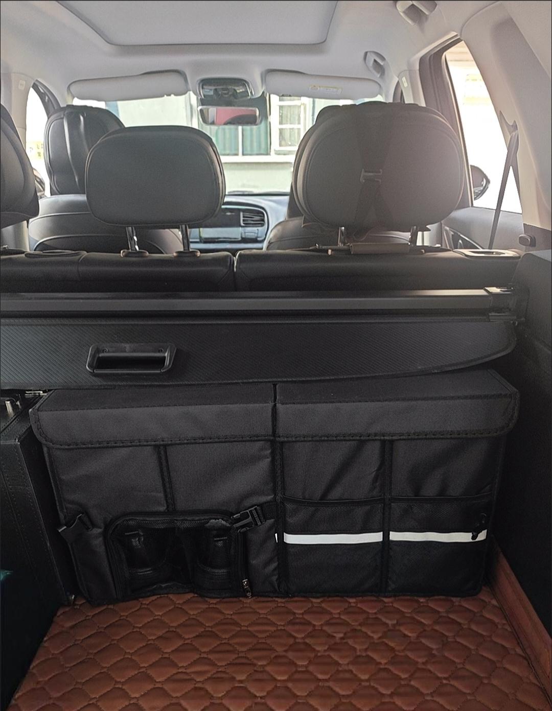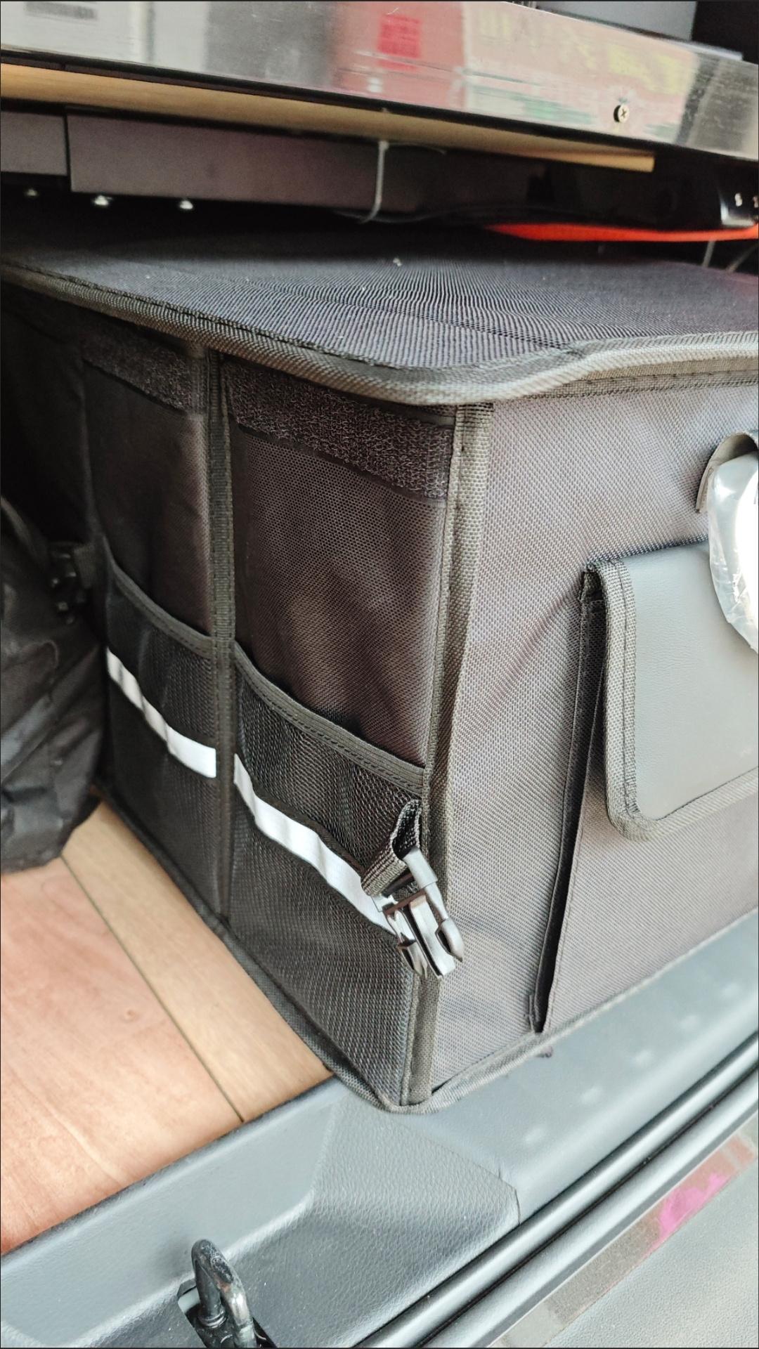 它是硬壳的,能承重,分上下两层。上层放常用的:孩子的玩具、车载急救包、充电线;下层放大件的:折叠推车、露营小凳子。侧面还有网兜,我把垃圾袋、擦车巾挂里面,随手就能抽出来擦手或擦车~