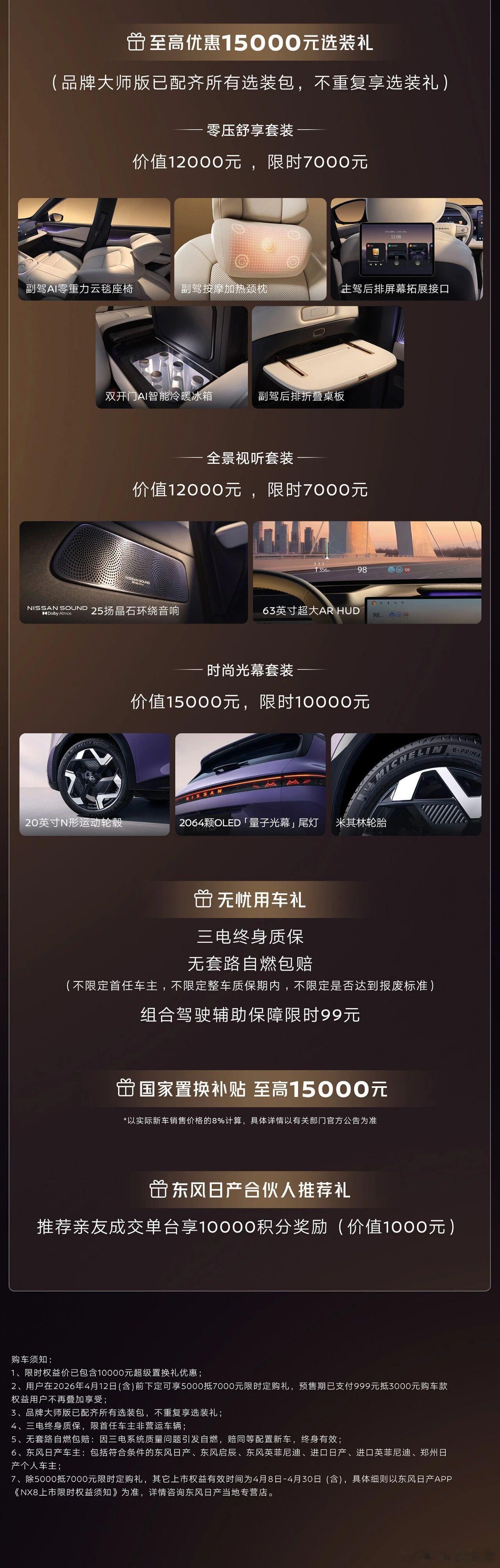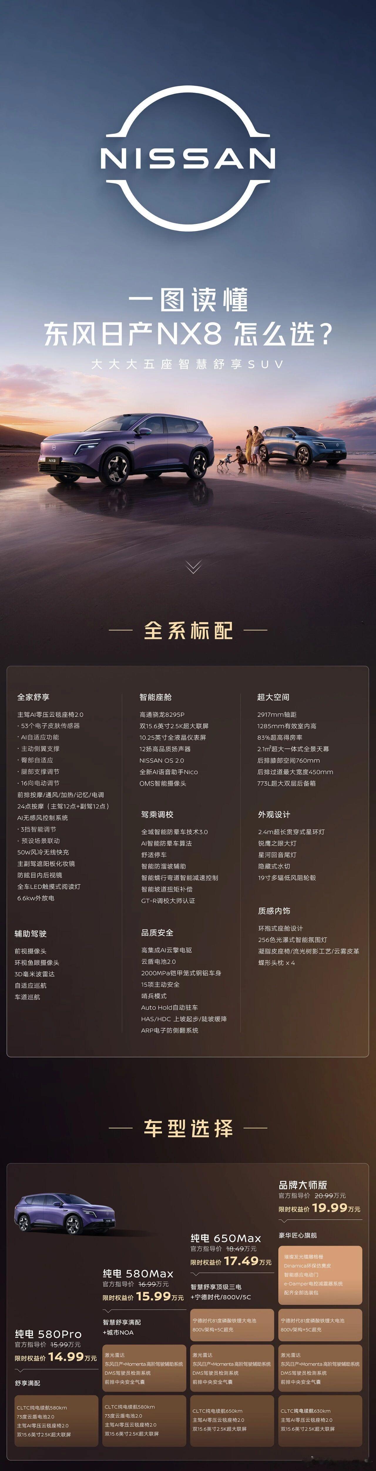 一图读懂东风日产NX8版型选购指南,2大动力,7种版型,71项全系标配,标配即满配。大大大五座NX8售14.99万起
