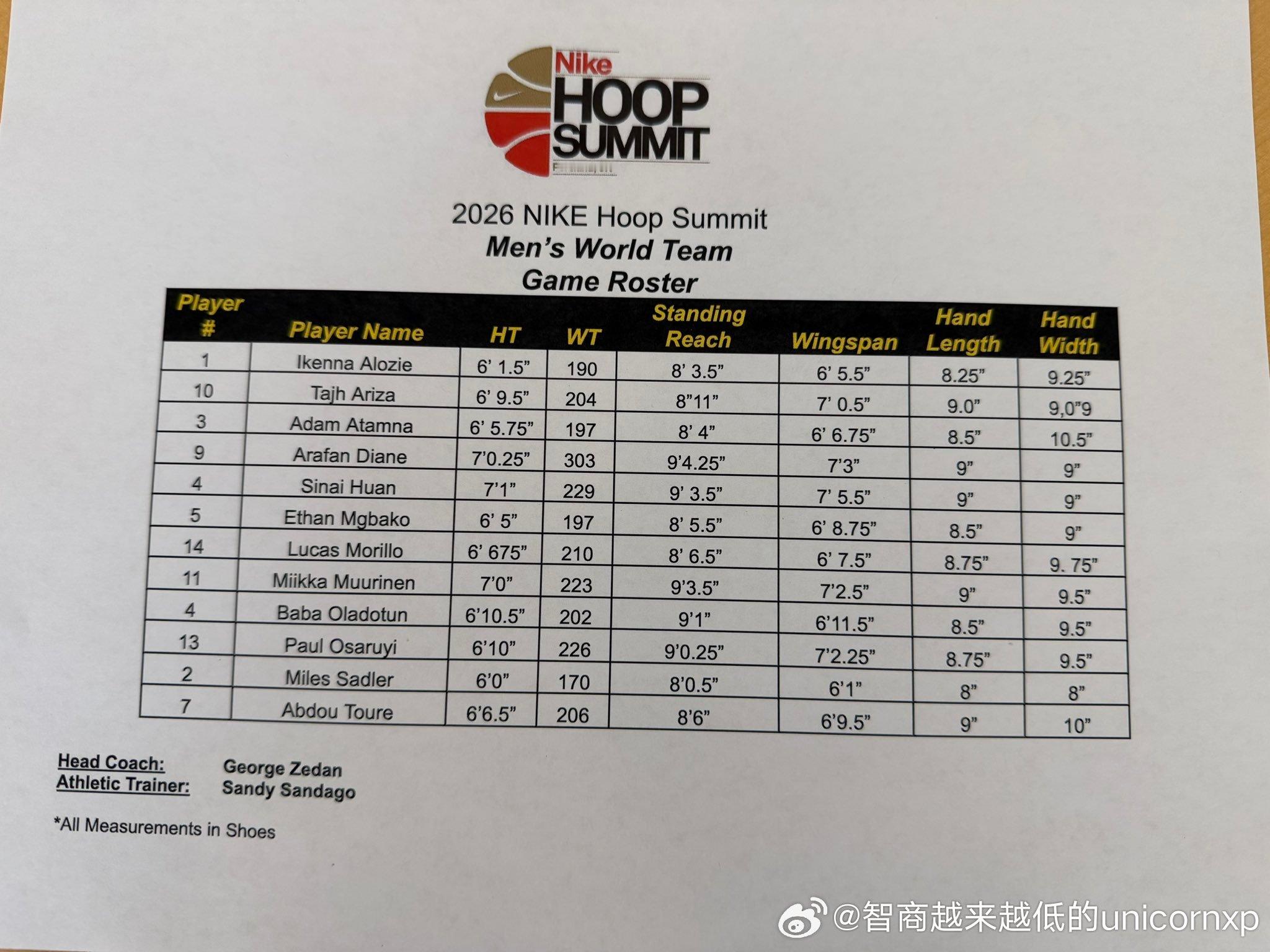 耐克篮球峰会体测出炉,郇斯楠穿鞋身高216公分,臂展227公分郇斯楠NCAA中国