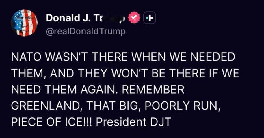 北约秘书长马克·吕特接受采访时候谈特朗普: “我们互相喜欢。我真的很钦佩他的领导力。” 然而,川普丝毫没留情面:“当我们需要他们(北约)时,他们不在,一次又一次。记住格陵兰,那个巨大、管理不善的冰块!!!”