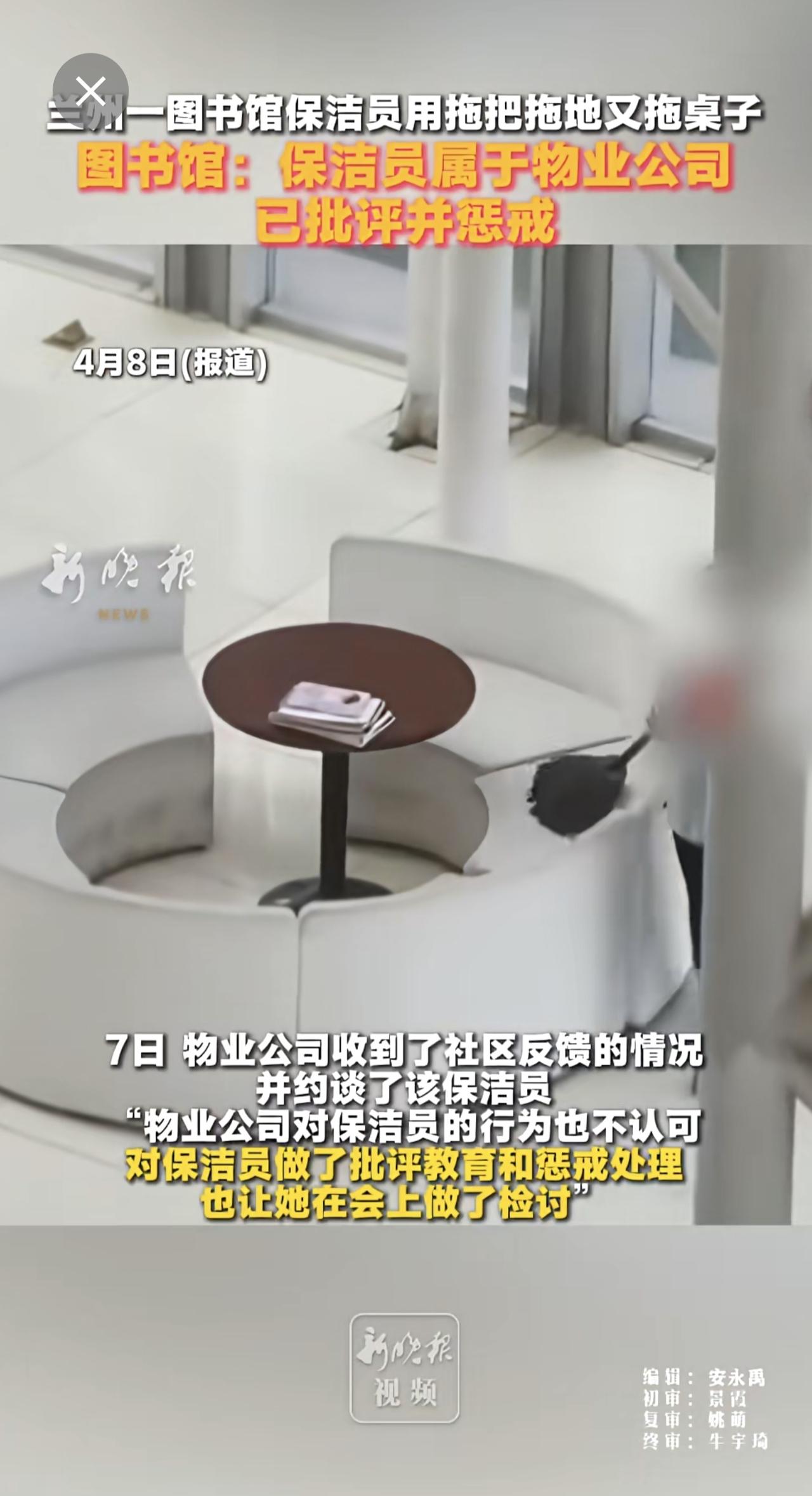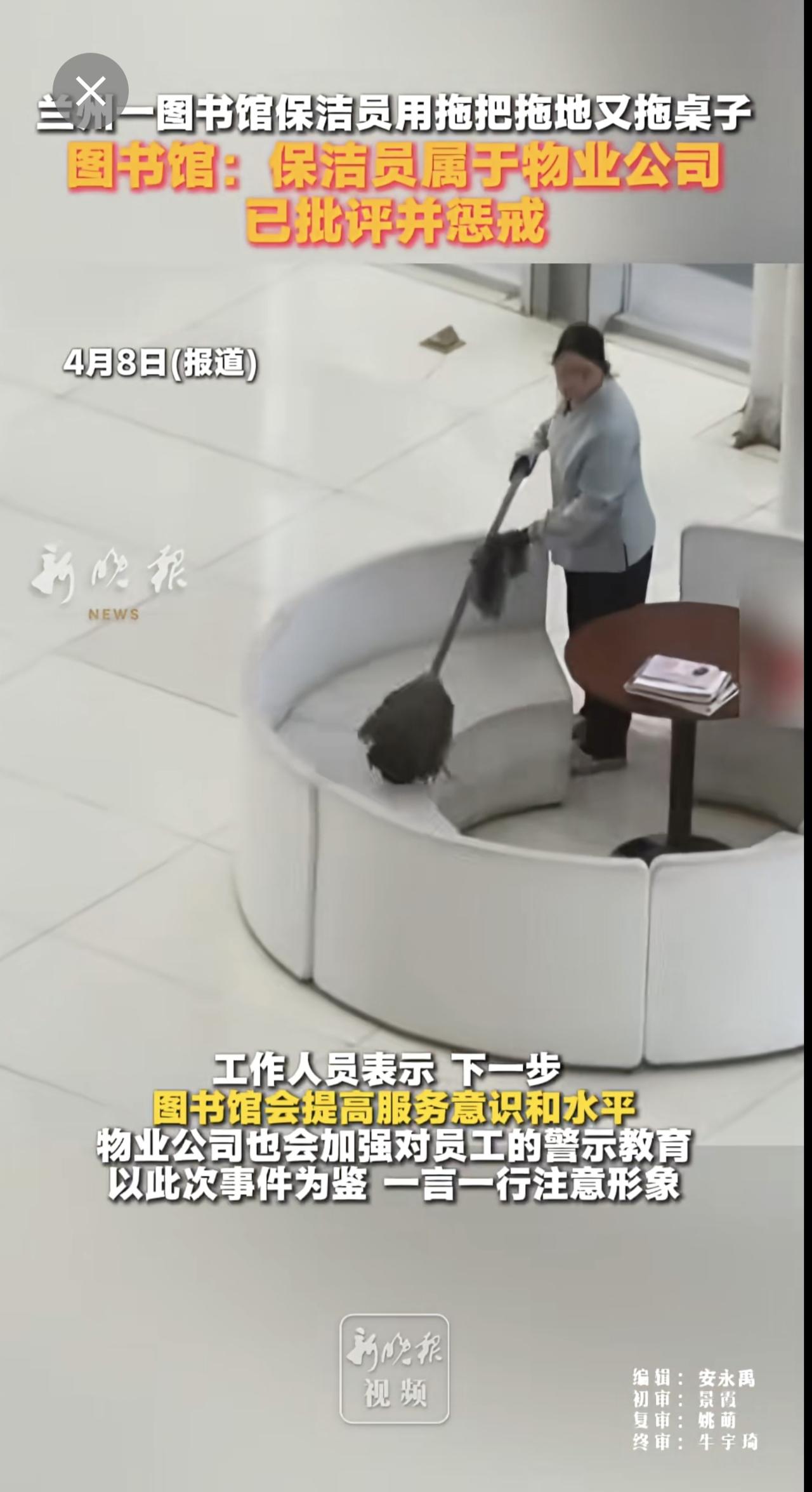 兰州一图书馆保洁员用拖把拖地又拖桌子,图书馆:保洁员属于物业公司,已批评并惩戒