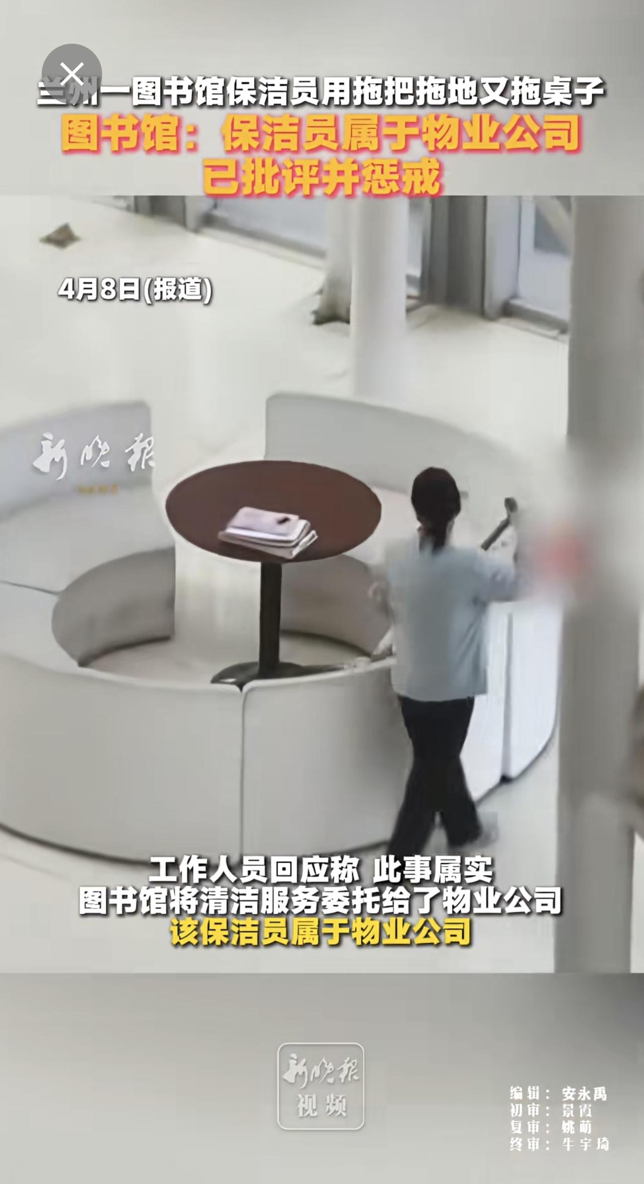 兰州一图书馆保洁员用拖把拖地又拖桌子,图书馆:保洁员属于物业公司,已批评并惩戒 图书馆