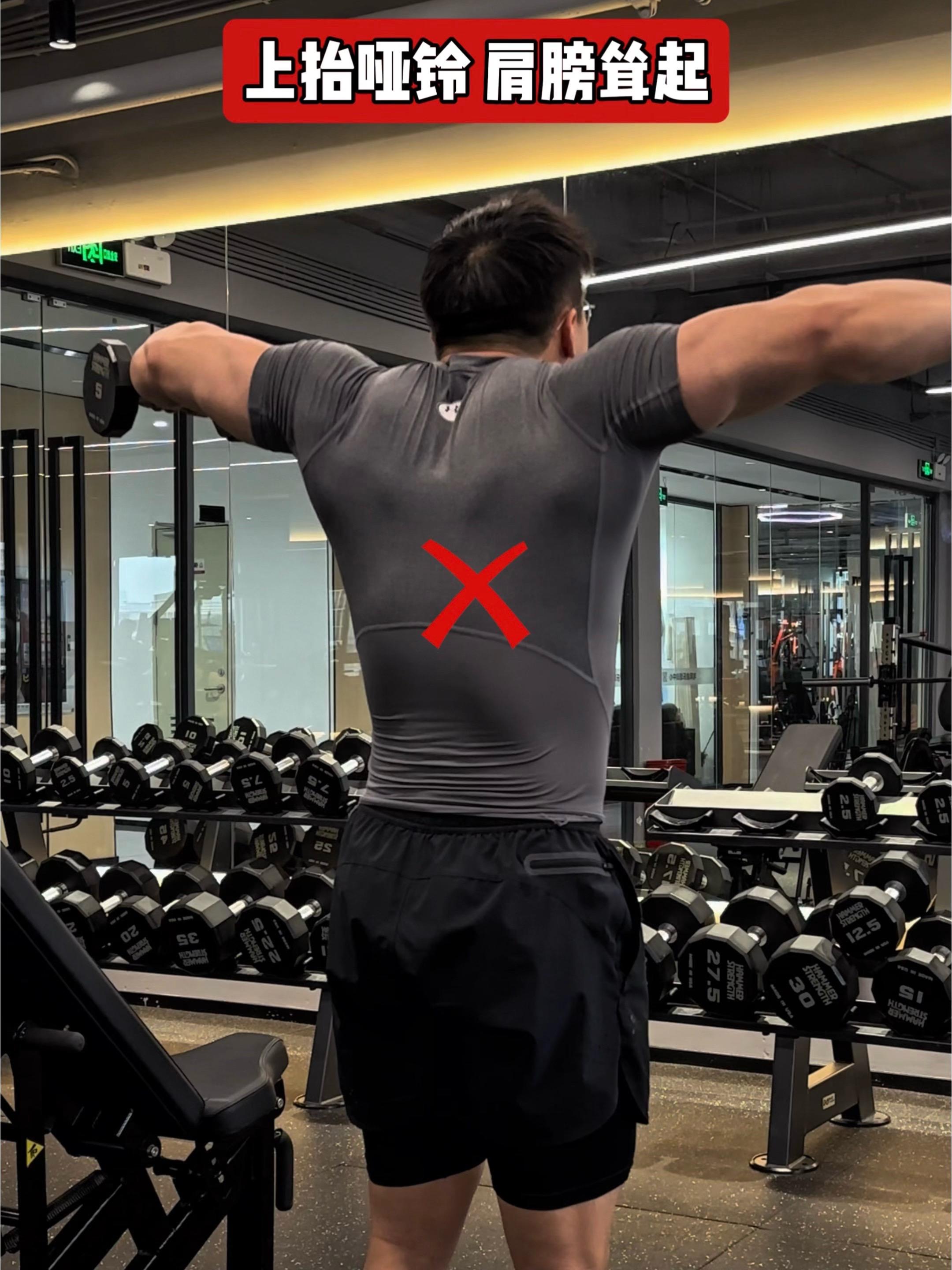 哑铃站姿飞鸟,常见问题纠正! 问题一:上抬哑铃,肩膀耸起❌