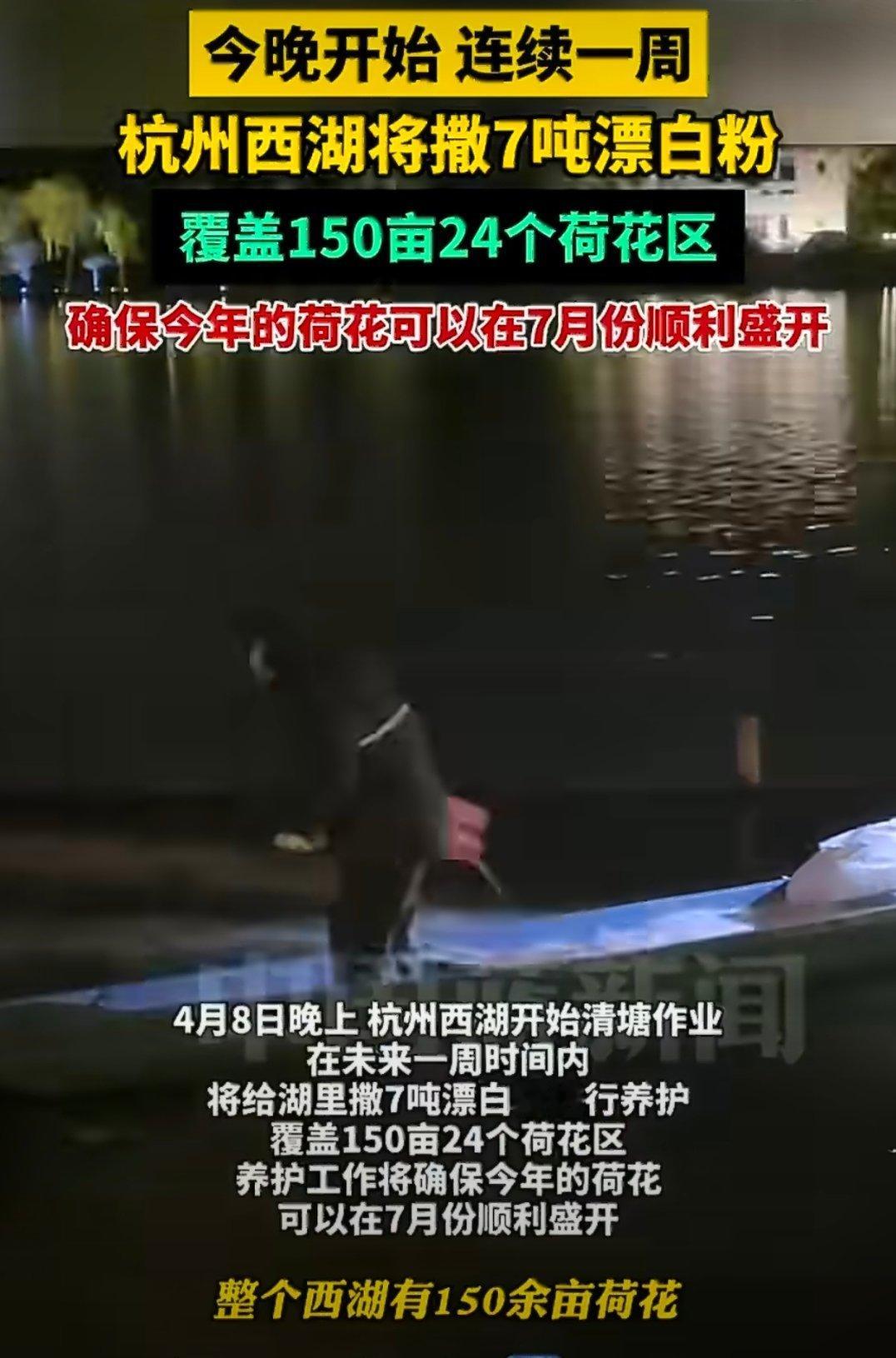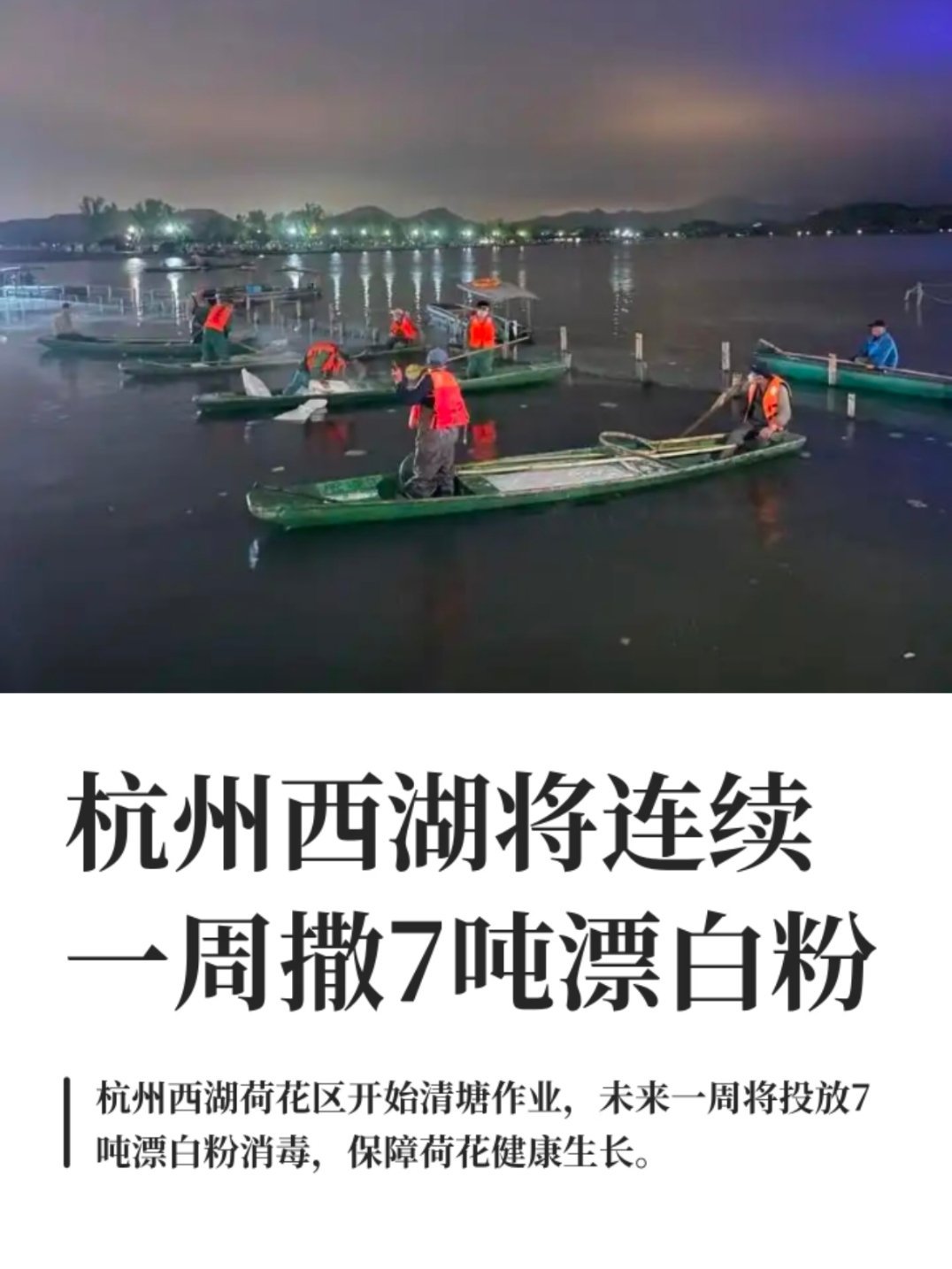 杭州西湖将连续一周撒7吨漂白粉简单来说就是:消毒抑菌、抑制藻类、温和驱鱼、保护荷芽!主要针对的24过荷花区,保障荷花健康生长!