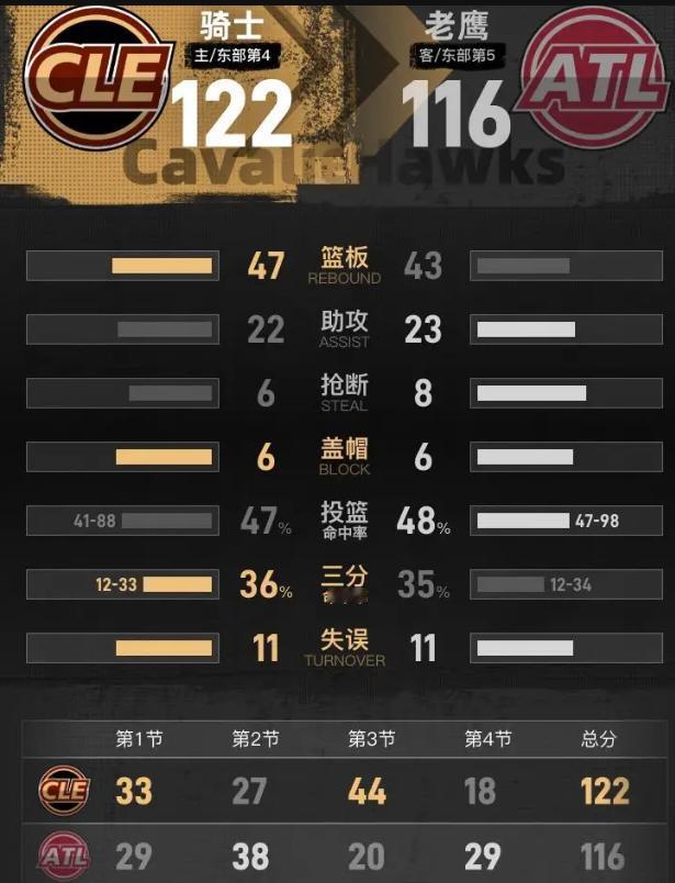 说白了,骑士这"球星兜底"模式,常规赛能凑合,季后赛就是定时炸弹。老鹰这帮孩子打的才是未来篮球——库明加、沃克、约翰逊,这韧性够东部喝一壶的。今儿这6分险胜,是给骑士的警钟,不是勋章。