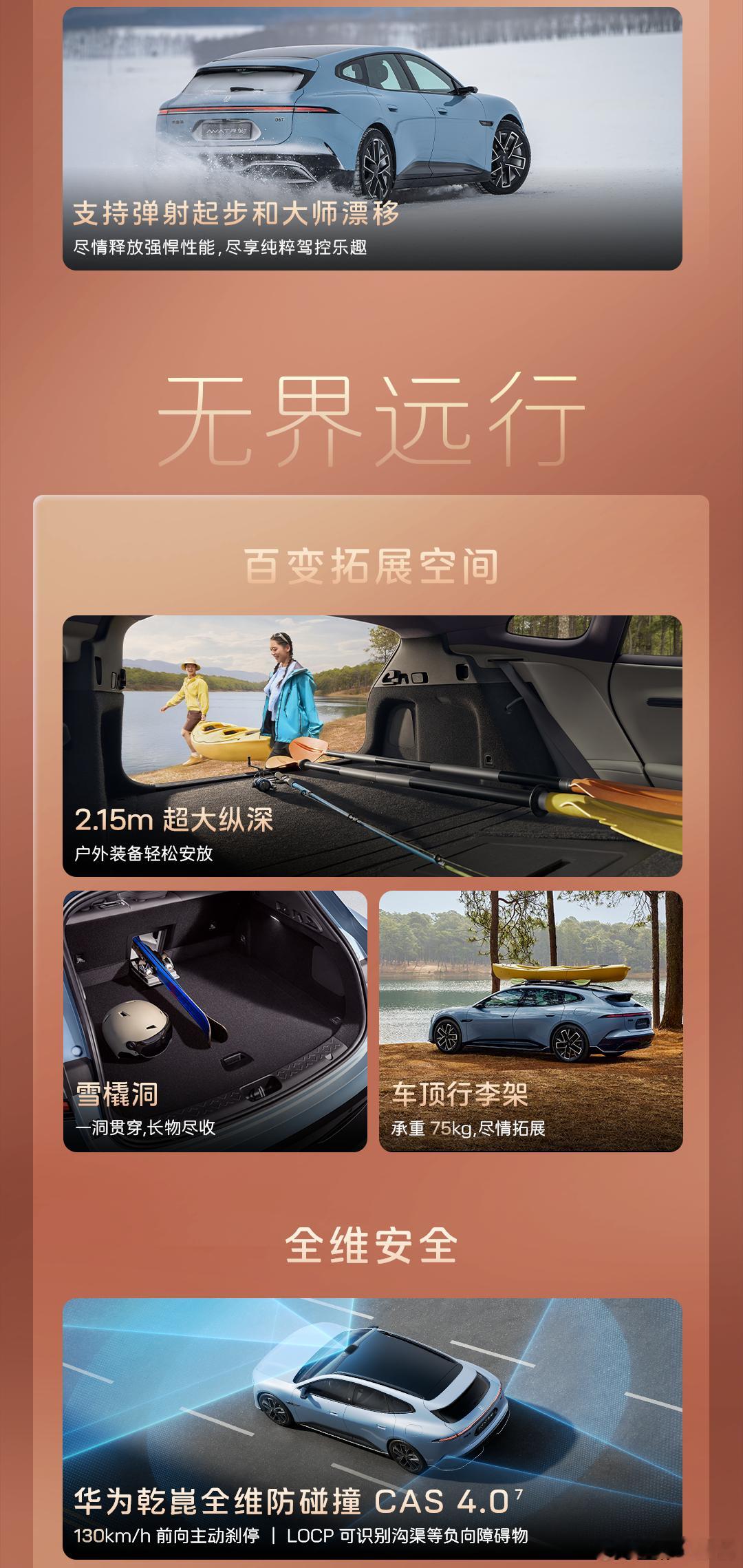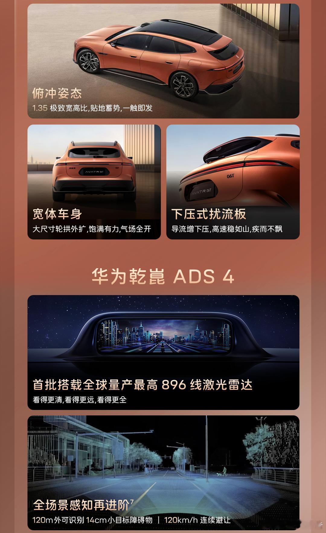 该车全系标配华为乾崑ADS辅助驾驶,入门版为舱内激光视觉版本,其他车型则为外置华为896线双光路激光雷达,均支持城区NCA辅助驾驶。