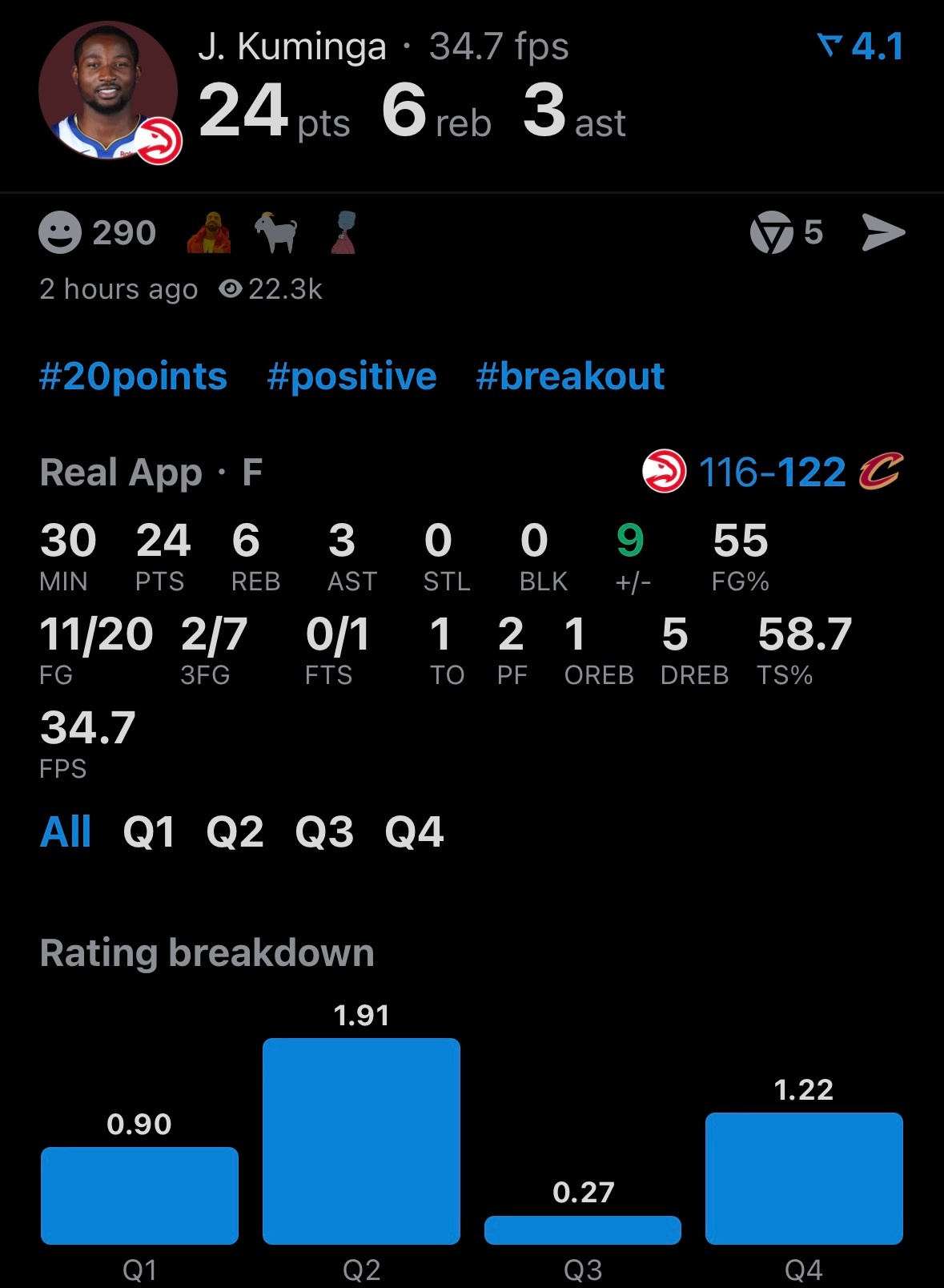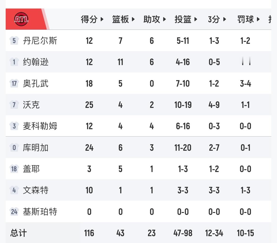 老鹰116-122不敌骑士,老鹰输了文森特没输!文森特替补15分钟,三分3投3中,得到10分1板1助攻,第四节被DNP。库明加替补30分钟,20投11中,得到24分6板3助攻,输球正负值+9。老鹰vs骑士