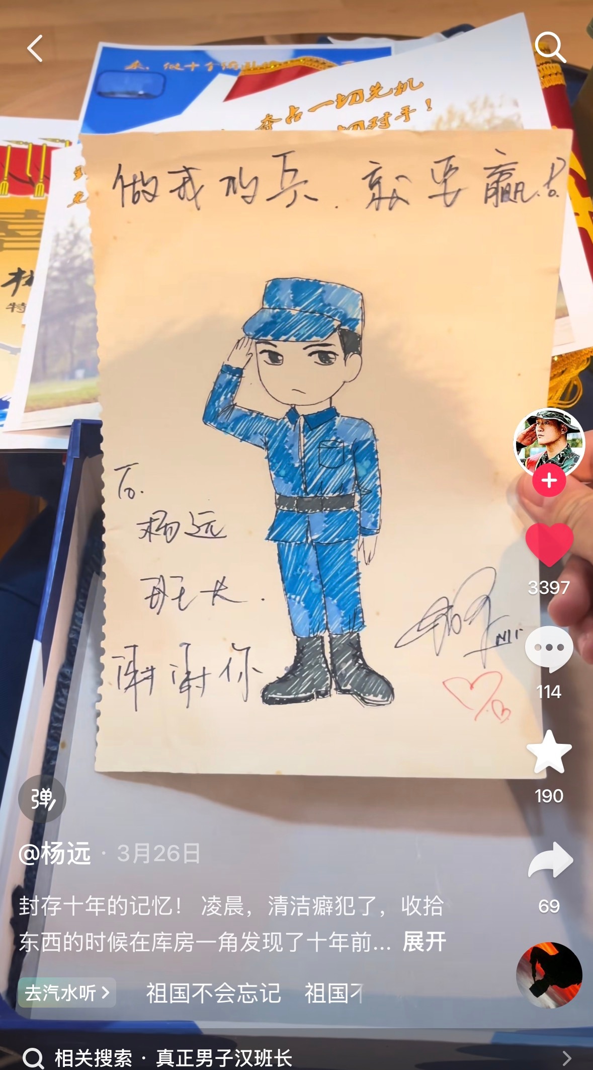 杨幂 原来在真正男子汉里,杨幂不仅给王威班长画了画,也画了亲笔画送给杨远班长!!前两天杨远班长发的抖分享了我们才知道🥹To:杨远班长,谢谢你! “做我的兵,就要赢!”