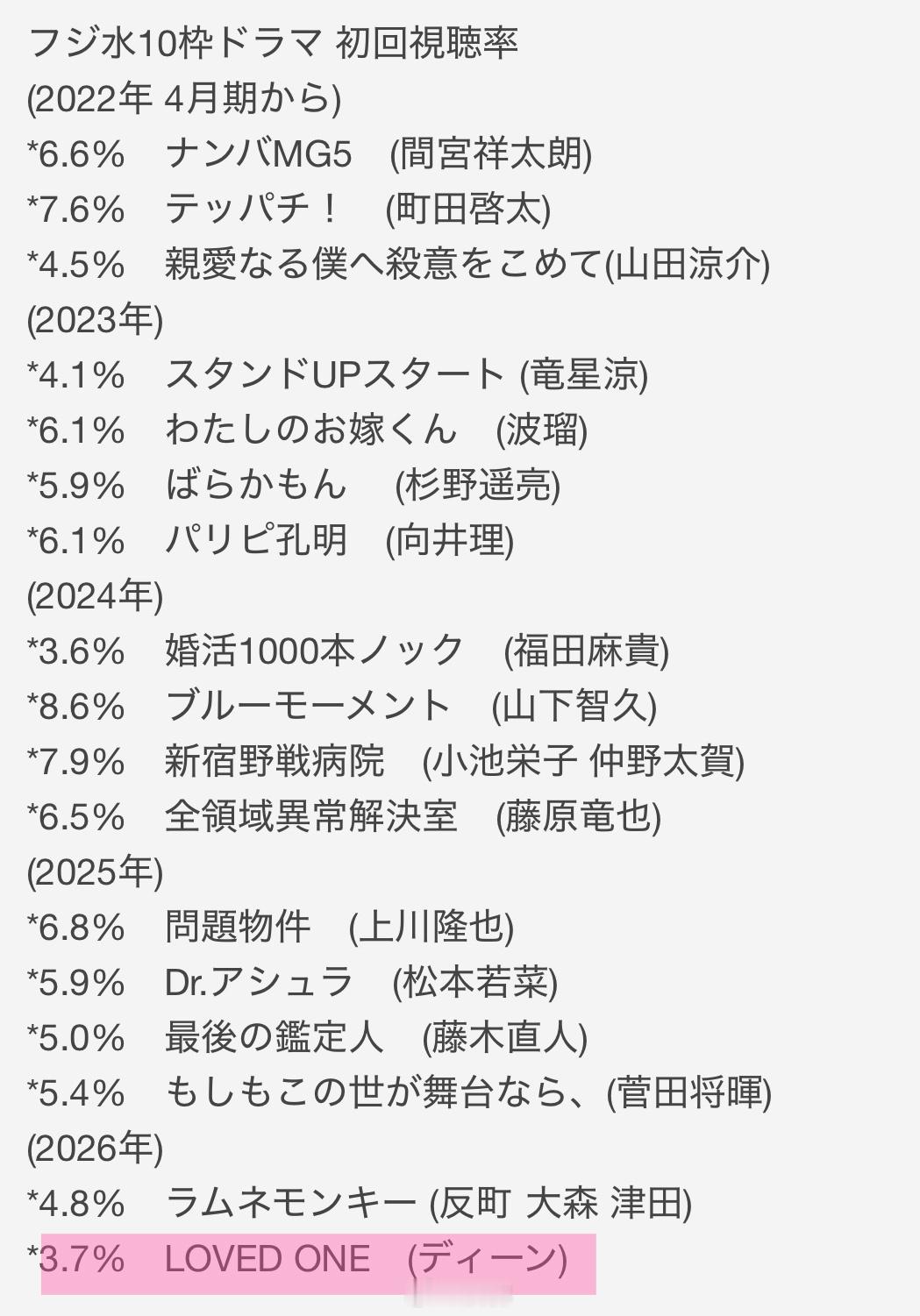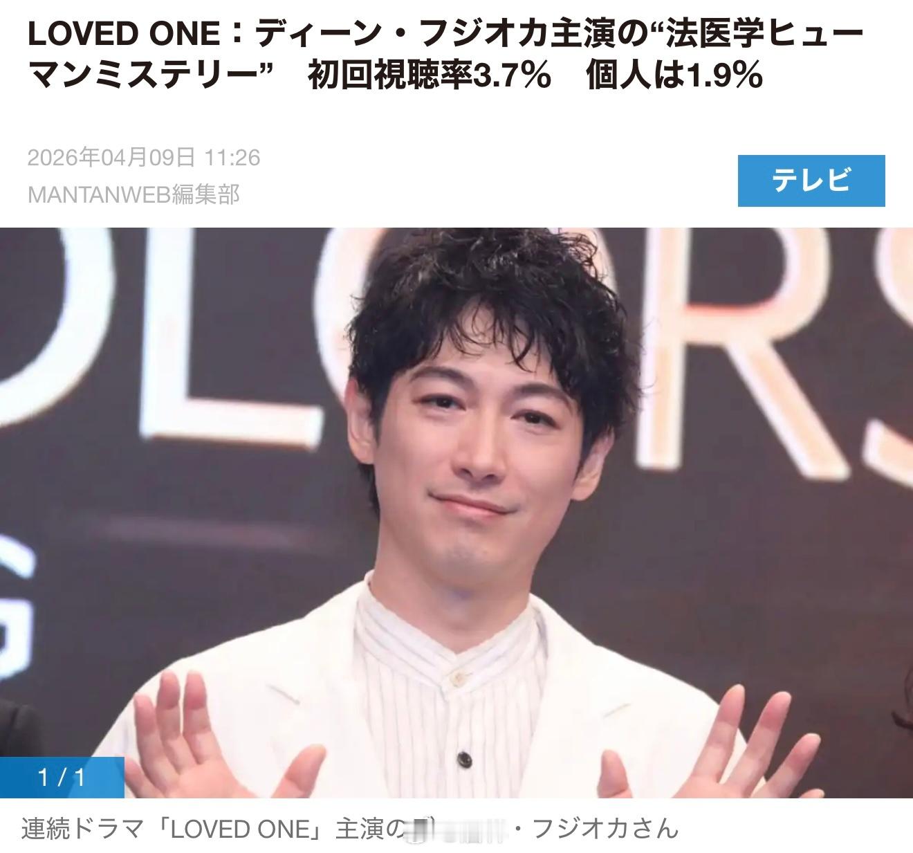 新剧开播:由演员藤冈靛(Dean Fujioka)主演的富士台水10连续剧『LOVED ONE』第一集于4月8日播出,平均收视率为世代3.7%、个人收视1.9%。