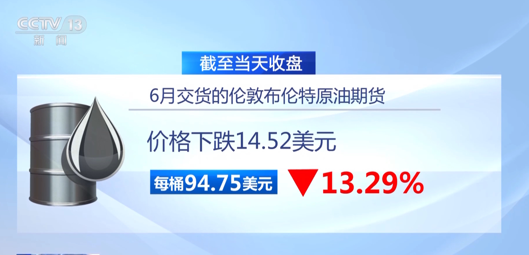 截至当天收盘,纽约商品交易所5月交货的轻质原油期货价格下跌18.54美元,收于每桶94.41美元,跌幅为16.41%;6月交货的伦敦布伦特原油期货价格下跌14.52美元,收于每桶94.75美元,跌幅为13.29%。(央视)伊朗革命卫队称准备回击以色列以空袭黎巴嫩致254死1165伤【美以伊冲突实时追踪:网页链接】