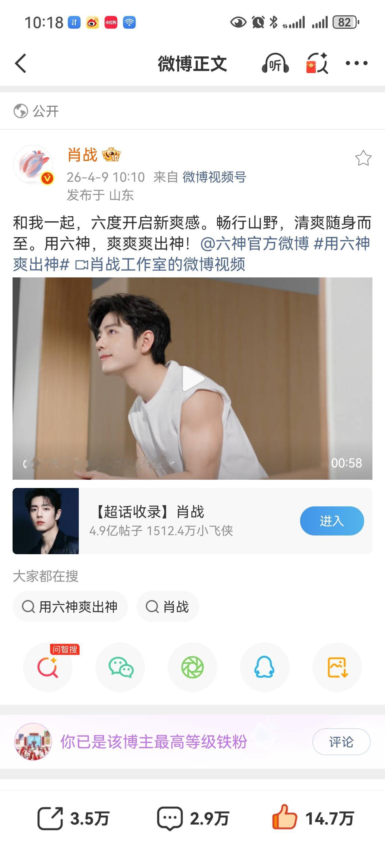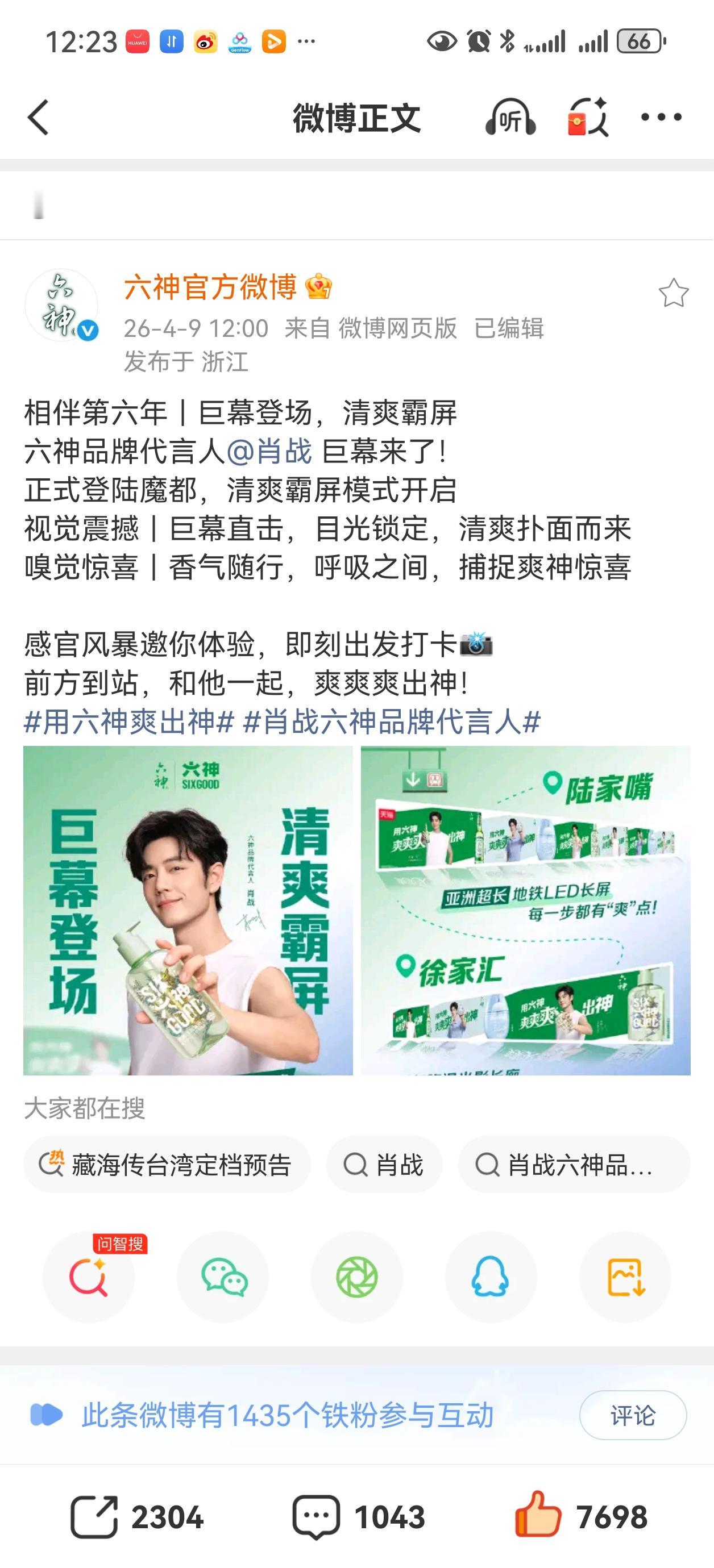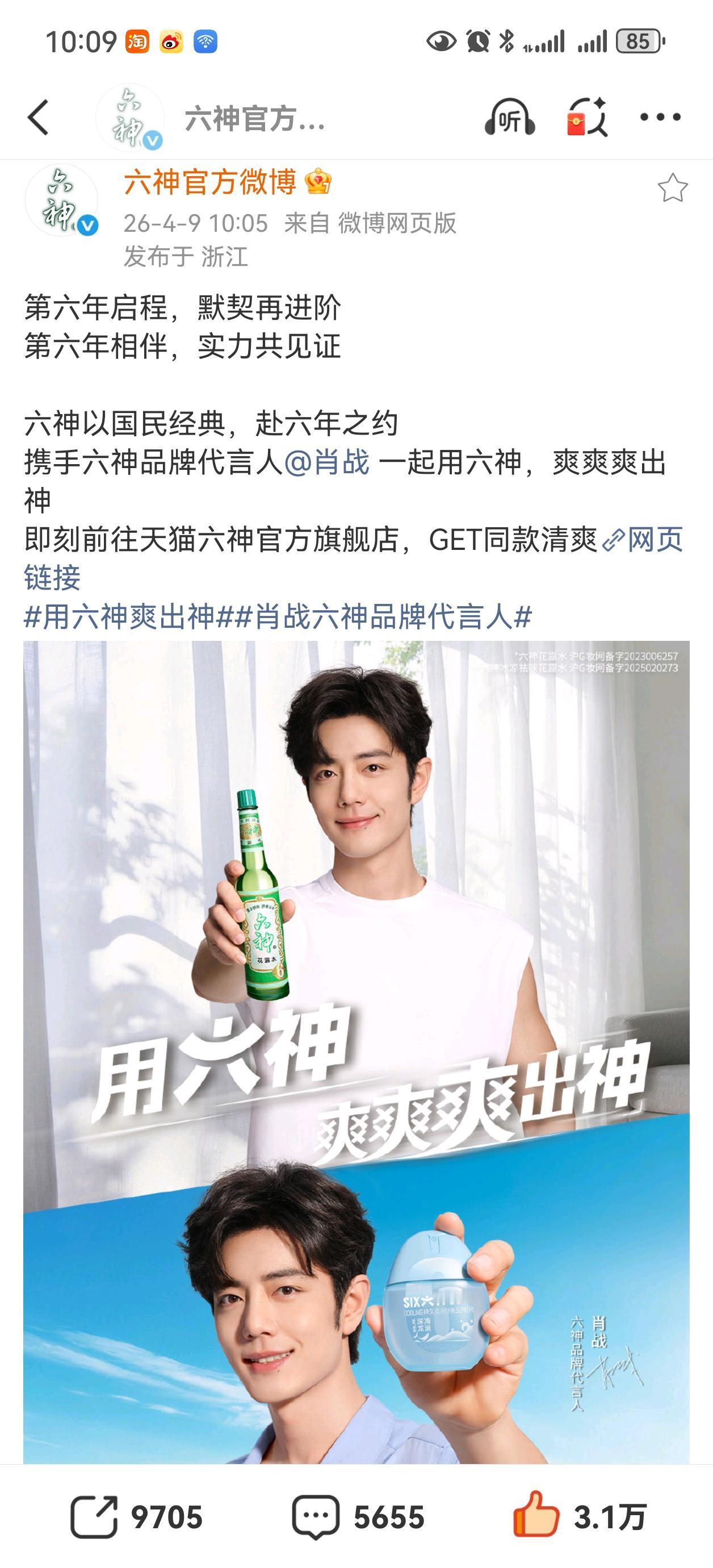 肖战和六神的第六年开始了,肖战的代言都是国民大品牌,而且都是长期合作,真好[呲牙][呲牙][呲牙]