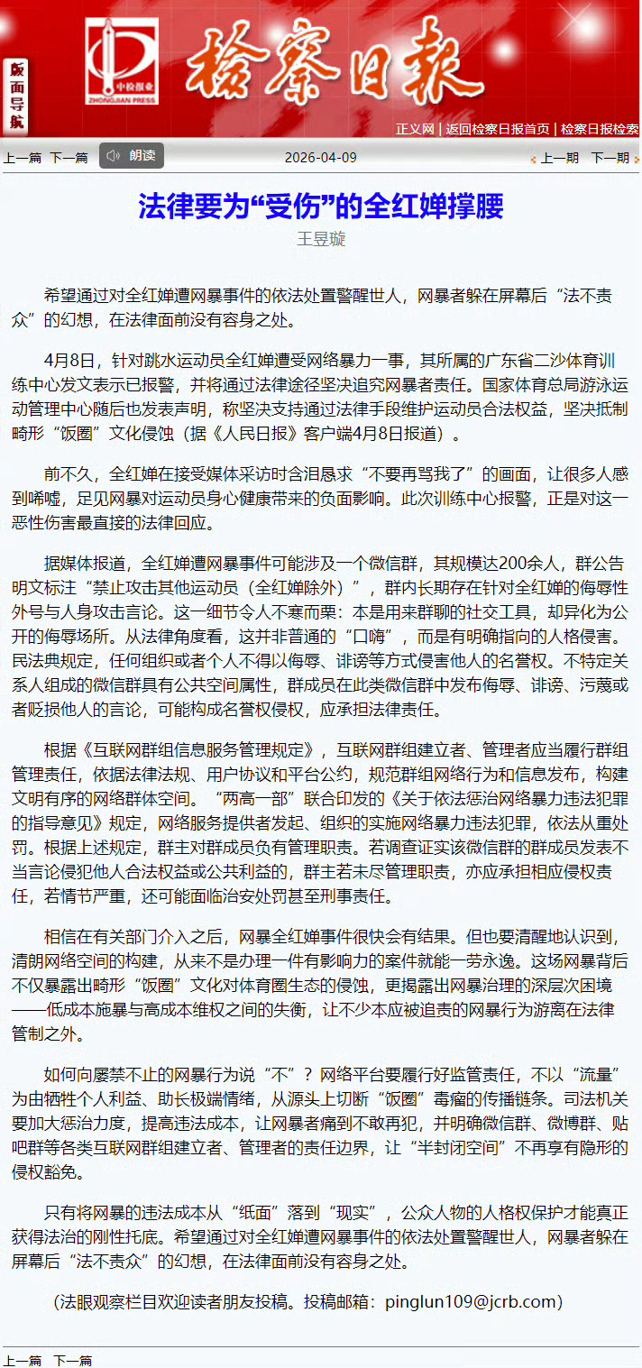 法律亮剑既是为全红婵维权,更是向所有网暴者敲响警钟:键盘伤人必追责,别让恶意寒了冠军的心!全红婵的遭遇已超过法律与道德底线