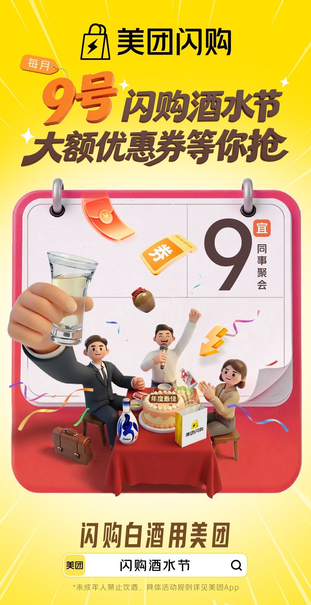 每月9日美团闪购酒水节 每月9号美团闪购酒水节都很值得期待,不管是家庭聚餐还是朋友小聚都能用上,好酒价格直降还有大额优惠券,4月9号美团名酒行茅台只要1539,上美团搜闪购酒水节就能轻松囤货闪购白酒用美团美团名酒行美团闪购酒水节