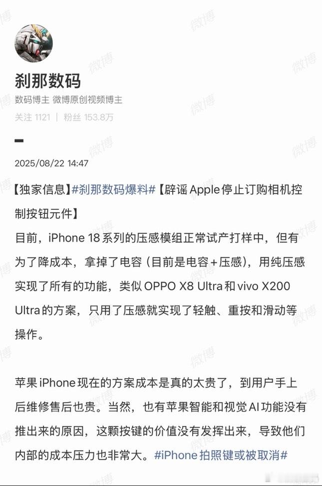 关于苹果产品的爆料,完全没必要去外面找转外面的,iPhone 18 相机按钮这事在咱自己中文圈,早就在去年 iPhone 17 系列发布之前就已经宣告全网了。曝iPhone18Pro简化相机按键iPhone18Pro相机按键或移除电容触控刹那数码爆料